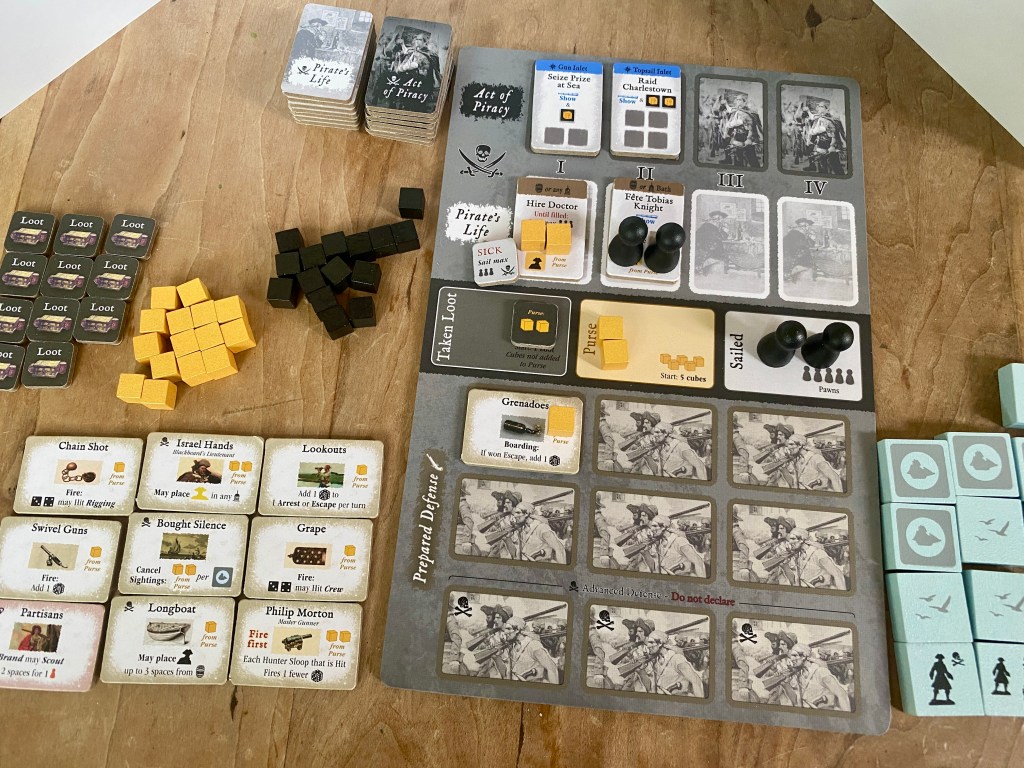 Volko: The game is built around an 11×17-inch gameboard with recessed spaces to hold standup wooden blocks that hide the pirates’ movements. The relatively small main board leaves table space for each player to have a screened game mat that holds some randomly drawn and some purchased secret tiles representing opportunities and capabilities for each side’s objectives. Custom wooden pieces, pawns, dice, markers, play aids, rules, and a volume of historical materials complete the package.