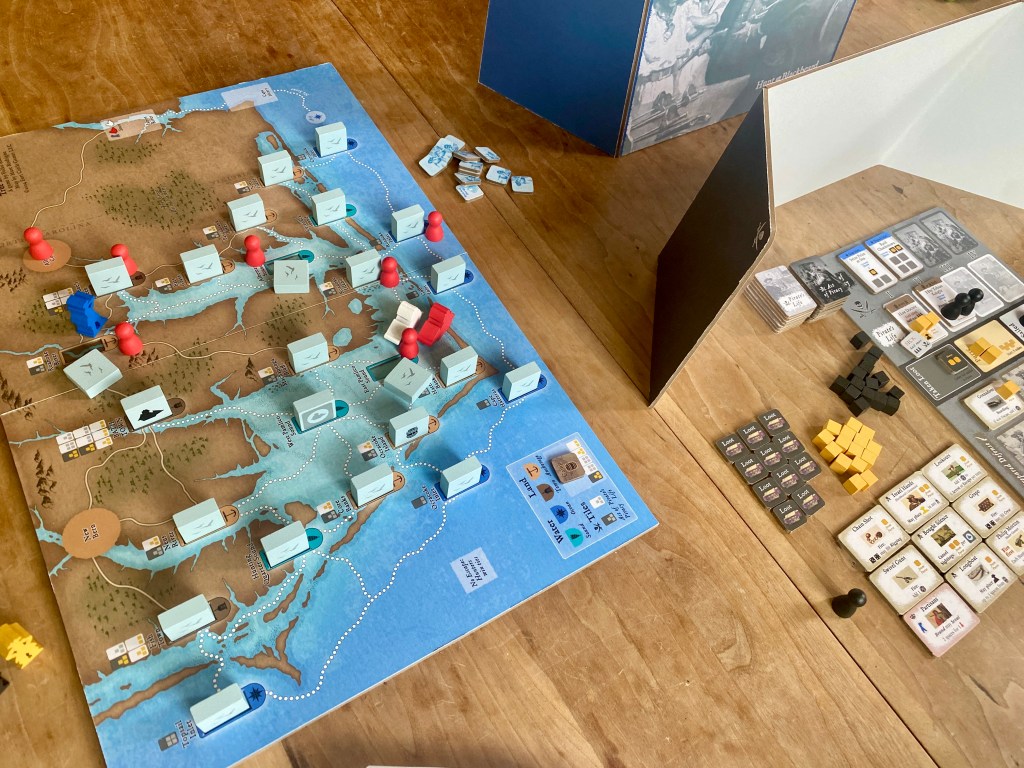 Volko: The central player interaction is via 24 standup blocks on the board. Images on the blocks face the Blackbeard player and show the location of the pirate’s sloop Adventure, the pirate camp, and perhaps individual pirate locations or signs of the ship’s passage called “Sightings”. The Hunters have two sloop pieces Jane and Ranger and a land character Captain Brand that move on the map, always visible to Blackbeard. Behind the screen, Blackbeard is pursuing “Piracy” objectives around the map of colonial North Carolina—usually by sailing his sloop. The Hunters behind their screen are interviewing Informants to secretly peek at various blocks, hoping to pick up the pirate’s trail. The Hunters also secretly equip their expedition from Virginia at the north edge of the map into North Carolina, where Blackbeard is hiding out.