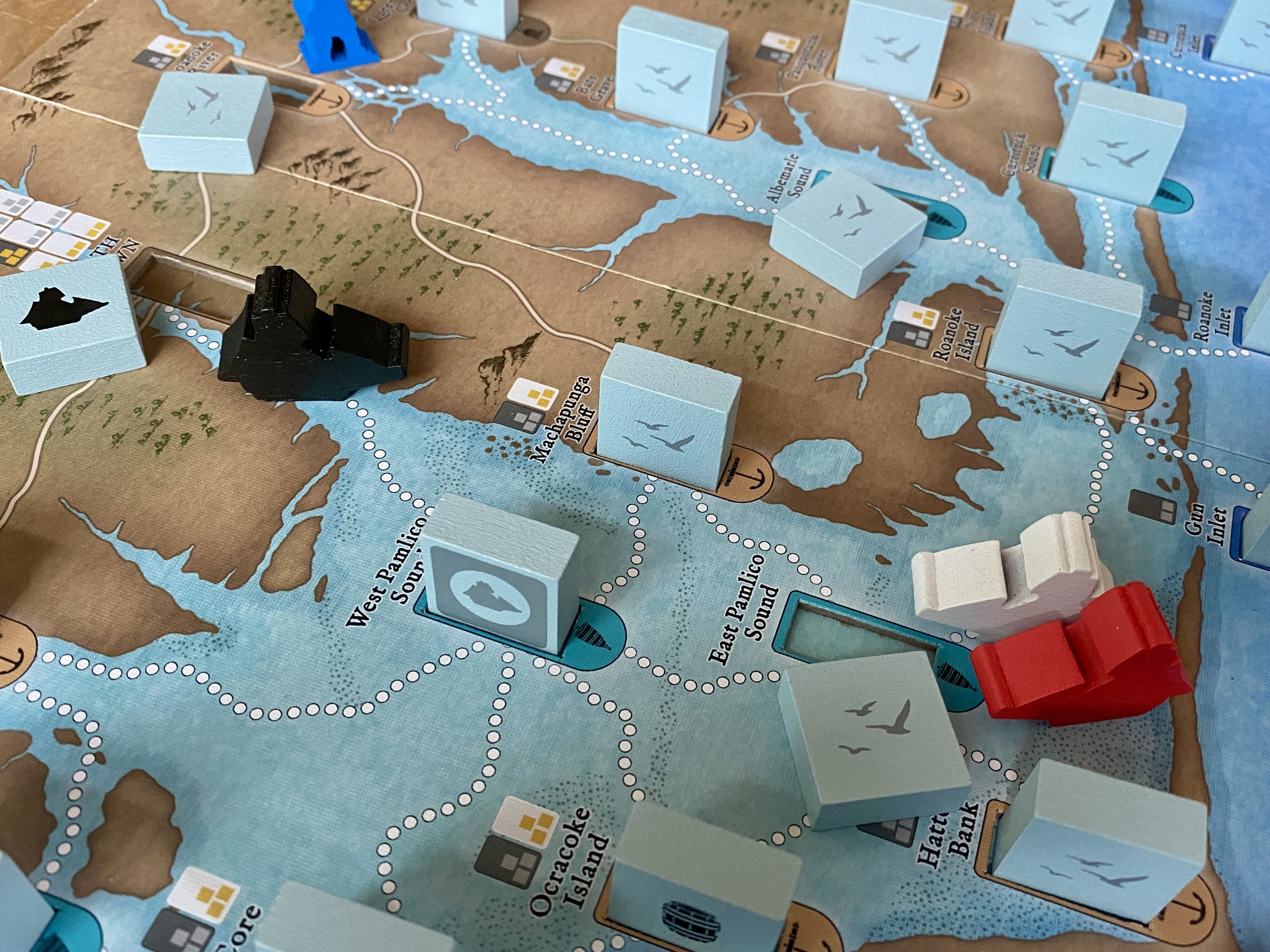 Volko: The game is at heart about intelligence and counterintelligence work. The Hunters seek to discern what Blackbeard wants and needs in order to predict where he might be and how well prepared for a fight. Blackbeard needs to balance success as a pirate against risk of discovery and capture and wants to know how much the Hunters already know—such as the location of the pirate camp. The game captures that struggle over information by enabling both sides to keep secrets, especially—in a way using the hidden location blocks that I do not believe exists in any previous historical games—to give the Hunters player secret knowledge about Blackbeard. “I know something that you don’t know that I know” is a way to describe such information advantage that the Hunters hope to gain.