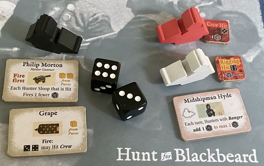 Volko: Blackbeard receives a gradually building series of missions over 4 turns, divided into “Acts of Piracy” (crimes) and “Pirate’s Life” (cashing in). To win, Blackbeard must fulfill at least half of either type of mission—while staying free. The Hunters must find and arrest or defeat Blackbeard in battle, which often involves figuring out in time which missions Blackbeard is after, since that will tend to determine where in North Carolina Blackbeard will be. The Hunters also can win by simply disrupting the pirate’s ambitions—blocking his missions. But the Hunters also can lose if they meet Blackbeard in battle and his sloop wins, so they hope to encounter Blackbeard’s Adventure with their sloops Jane and Ranger well prepared and sailing together.
