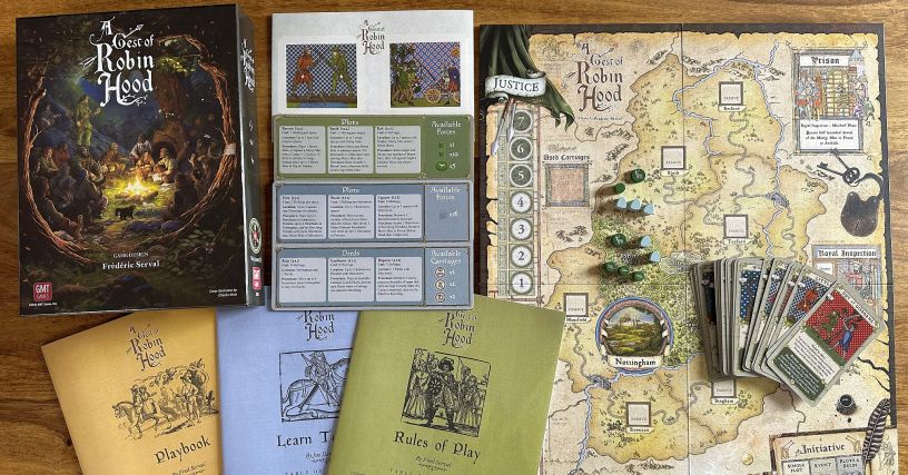 It is finally here – A Gest of Robin Hood by Fred Serval, published by GMT Games! In this two-player, COIN-adjacent game, we will have possibility here to lead that legendary character and his Merry Men against the evil Sheriff of Nottingham and his Henchmen! Or… we can do it we other way round and try to capture the legendary Robin Hood!