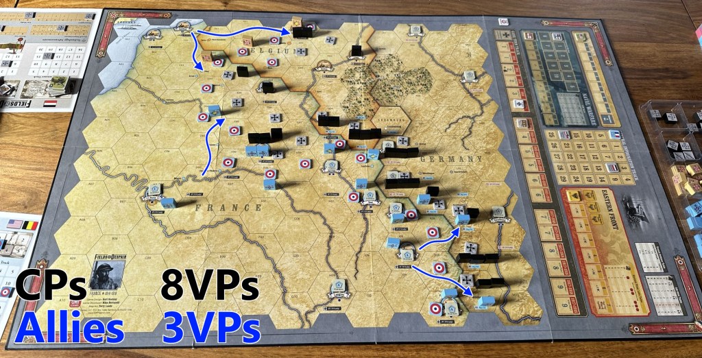 The Turns 1-3 are scored just like in Scenario I; however, during the Turns 4-9, the control of territory in Belgium and France is taken into consideration (and the actual changes from Turn to Turn).