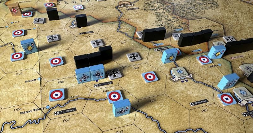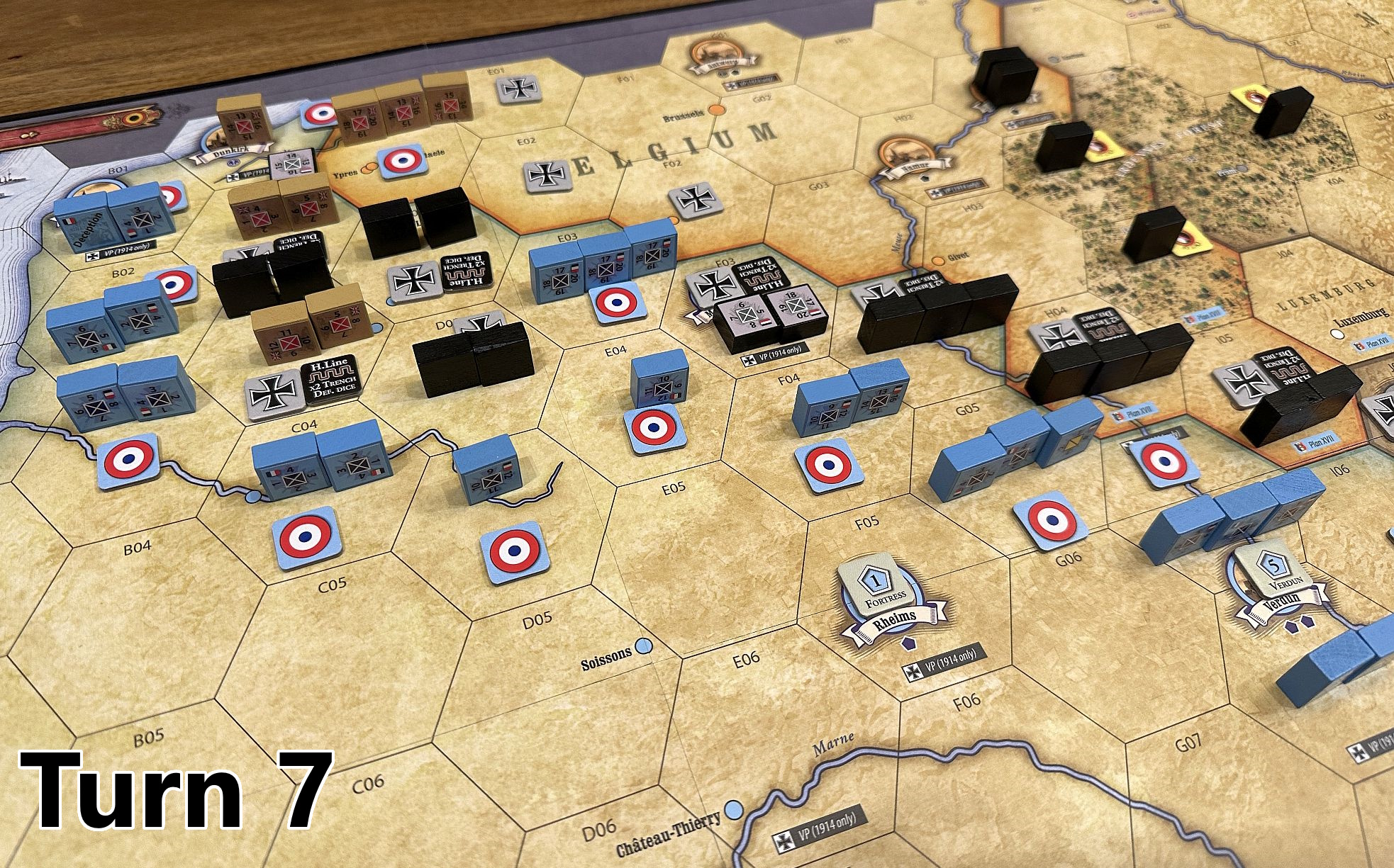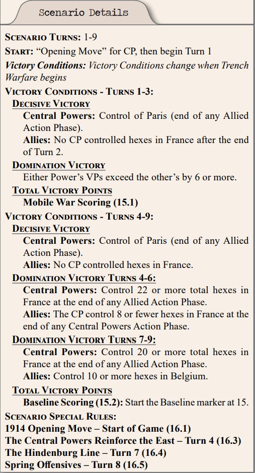 The Grand Campaign links all three base scenarios together from the Central Powers “Opening Move” in August of 1914 to the final Allied push of 1918. As the situation changes during this period (a global state of Trench Warfare begins on Turn 4), the victory conditions has to adapt appropriately.