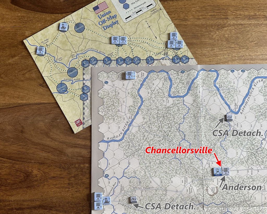Broadly the Union wants to get as many of their forces from off map across the river to turn Lee’s left flank. The Union should strive to eliminate the two exposed CSA detachments and Anderson a (located and stacked with Hooker HQ at Chancellorsville). This intentionally should give the Union a 2 VP lead that incentivizes the CSA to become offensively oriented. (Fig. 1)