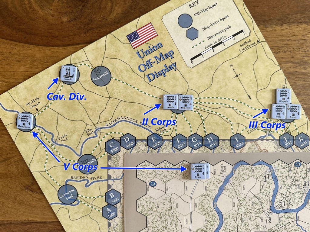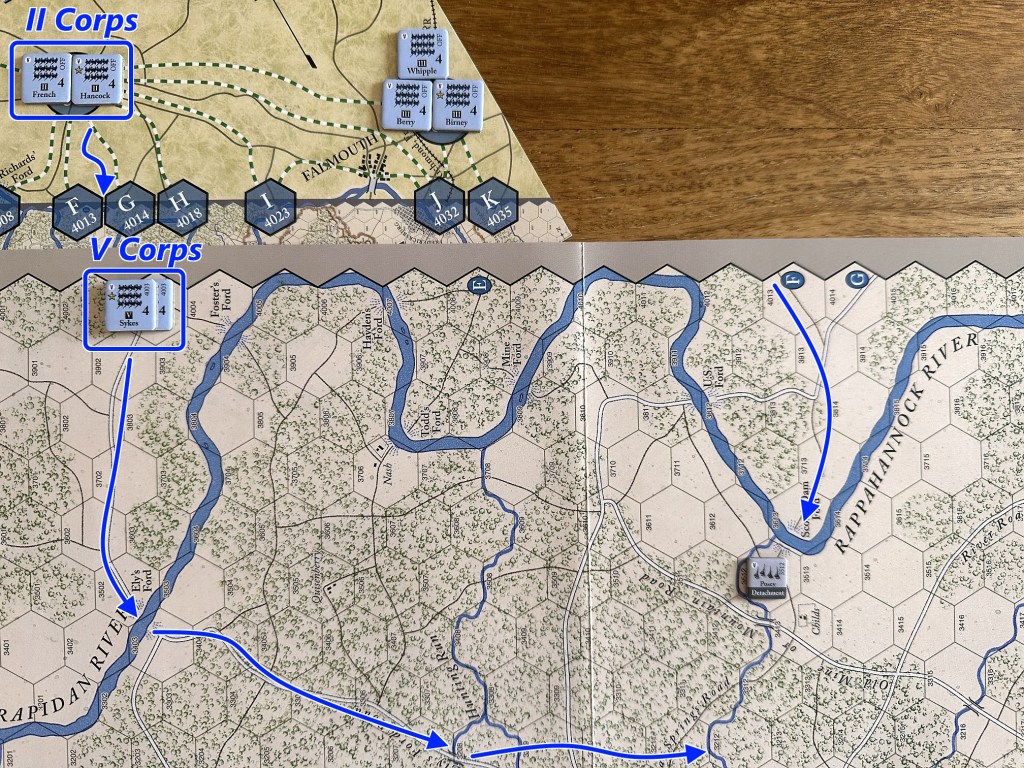 Vth Corps: This is the highest quality Corps in the Army of the Potomac, with two of its Divisions entering from the North corner of the map. Getting them across the river and into action on the left flank allows this Corps to coordinate its actions with the Union IInd Corps located at Hartwood Church. The Vth Corps can get across the river and use battle formation to advance along the river, not clear if building a pontoon bridge creates much benefit other than to speed the third Vth Corps division at Germanna Ford onto the map quicker in later turns. (Fig. 3)