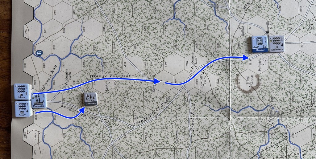 I will organize the turning movement from a left flank and main effort perspective. For the left flank we have the Union Vth, IInd (Hartwood Church), and IIIrd Corps (Union Camps). The main effort is the Union XIth and XIIth Corps entering from the Northwest (hex 2600). (Fig. 2)