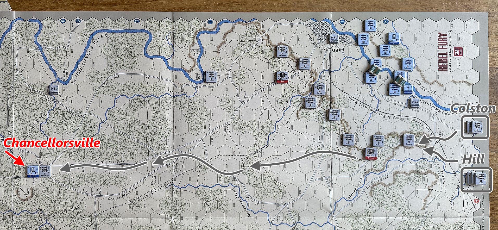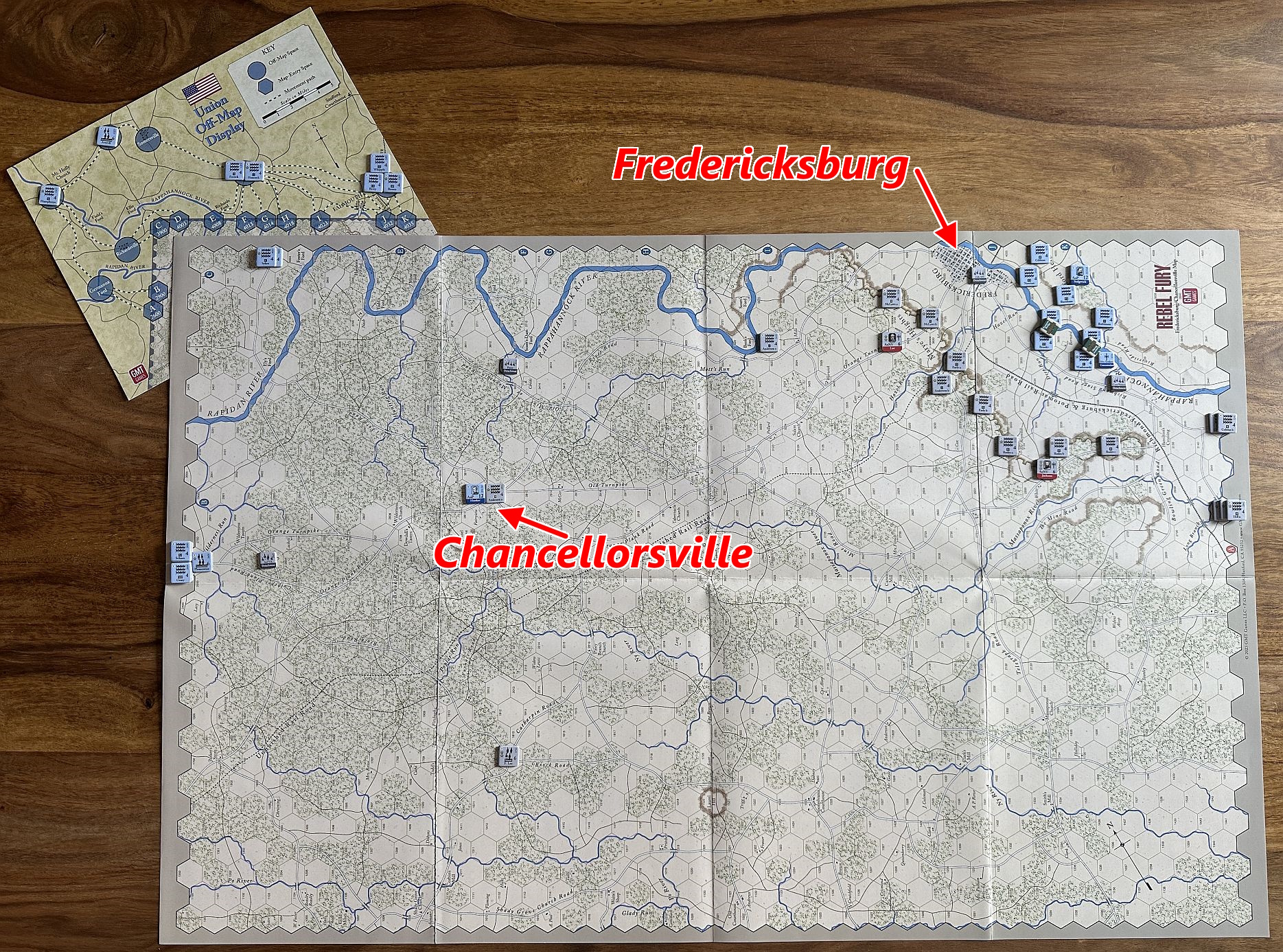 Broadly the Union wants to get as many of their forces from off map across the river to turn Lee’s left flank. The Union should strive to eliminate the two exposed CSA detachments and Anderson a (located and stacked with Hooker HQ at Chancellorsville). This intentionally should give the Union a 2 VP lead that incentivizes the CSA to become offensively oriented. (Fig. 1)