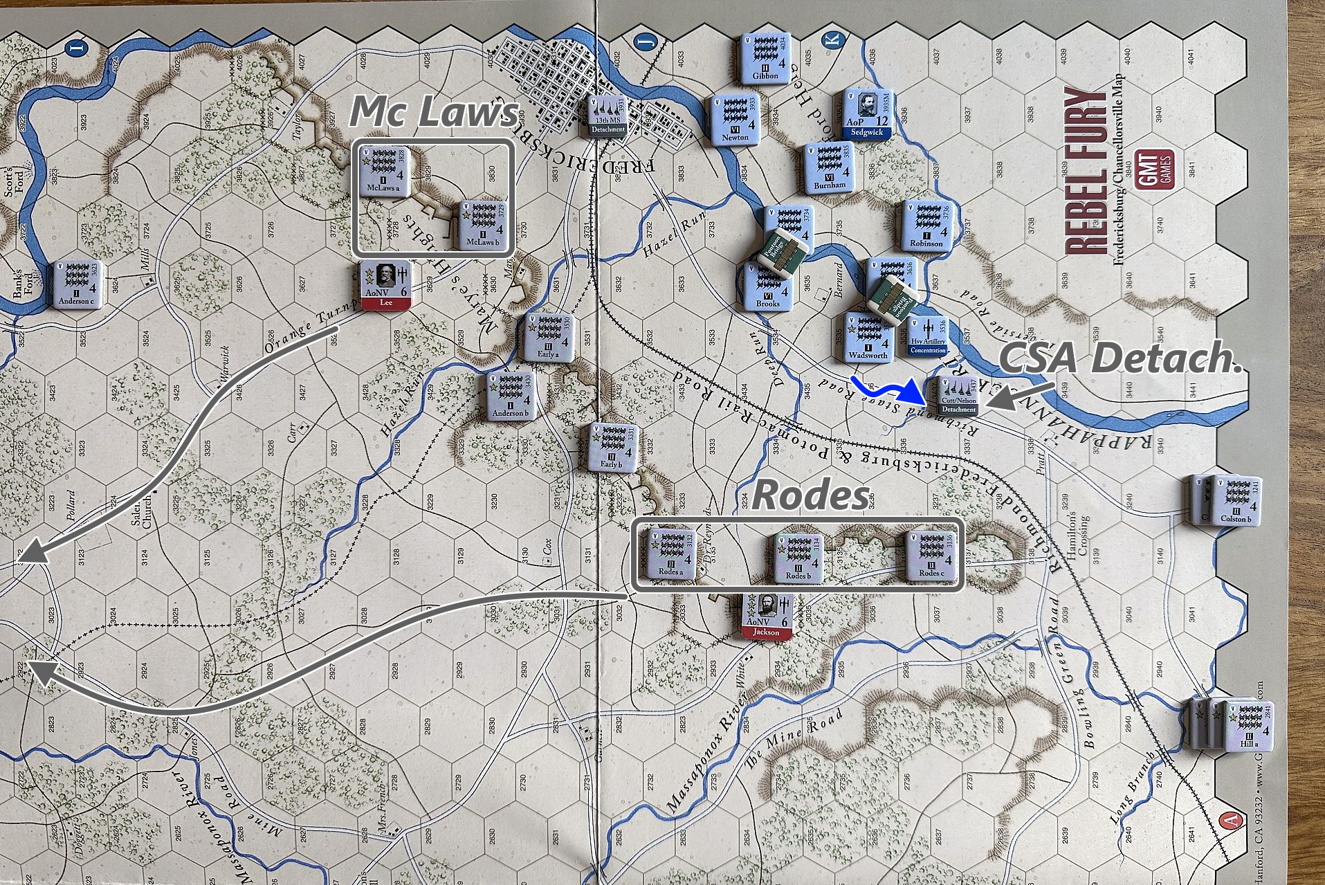 Sedgewick is an important element in the Union strategy, but in the opening they should focus on eliminating the CSA detachment to score another VP and open the road to the CSA right flank whose entrenchments do not cover the river. At some point the CSA either has to freeze their forces on the Fredericksburg line or take the risks that Lee took to pull Rodes and McLaws off of the line and send them toward Chancellorsville. (Fig. 5)
