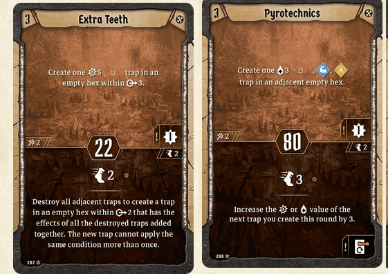 - Level 3 – As a more support-oriented class, I chose Pyrotechnics. I value its mobility, and the ability to increase the strength of the next trap by 3 adds extra value, enabling the creation of super traps more quickly. Extra Teeth was also very tempting, as it potentially allowed for building super traps. However, given my playstyle of usually creating a long continuous path of weaker traps to funnel enemies into a narrow corridor, I rarely had enough traps around to fully utilize its bottom action. Both cards are excellent, but I opted for the more supportive and versatile option.