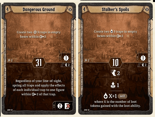 - Level 4 – Another seemingly difficult choice for a Trapper is between two offensive traps or two defensive (healing) traps. For me, the choice was easy—Stalker’s Spoils is fantastic. Its excellent initiative alone is impressive, and when combined with Boots of Speed, it guarantees you act before enemies. The ability to move 2 and loot is superb, even without the extra healing. The top action is outstanding, allowing you to create two traps in a single action. A tanker can go on the counter-offensive, walking through these traps and healing by 6 (or 9 if combined with Pyrotechnics). I cannot imagine a better card for a support role.