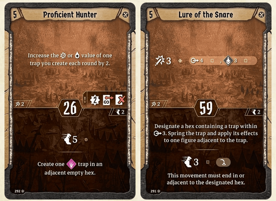 - Level 6 – Both cards are good. I chose Persistent Pitfalls primarily for its excellent initiative combined with a high-power, non-lost stun trap. With Proficient Hunter and Pyrotechnics, this can become an 11-damage + stun trap in one turn! I rarely used the bottom action, but it offers a great combination against strong bosses. When paired with Path of Pains top action, it can even help you achieve mastery by pushing an enemy through several traps, though this is very difficult to execute. I mainly used it for the top action, as stun is the best de-buff.