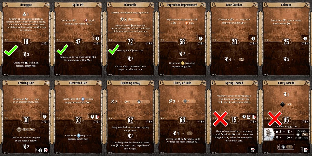- Honeypot – very quick initiative of 18 for Trapper. Also, one of my favorite kind of cards with bottom movement and traps creation! I rarely used the top in order to spawn traps (maybe once or twice). At some point can be replaced by stronger card.