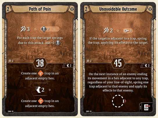 - Level 6 – Both cards are good. I chose Persistent Pitfalls primarily for its excellent initiative combined with a high-power, non-lost stun trap. With Proficient Hunter and Pyrotechnics, this can become an 11-damage + stun trap in one turn! I rarely used the bottom action, but it offers a great combination against strong bosses. When paired with Path of Pains top action, it can even help you achieve mastery by pushing an enemy through several traps, though this is very difficult to execute. I mainly used it for the top action, as stun is the best de-buff.
