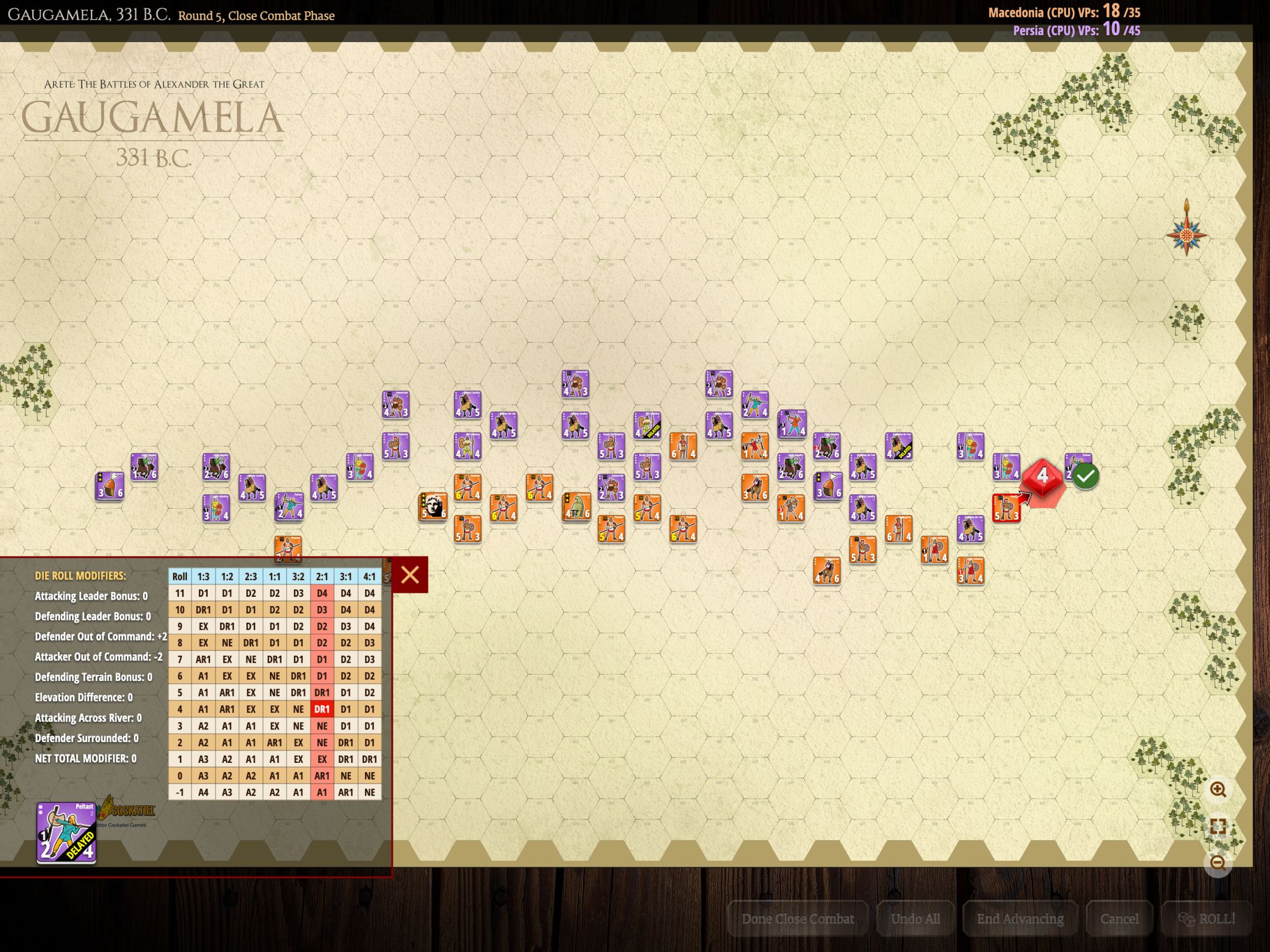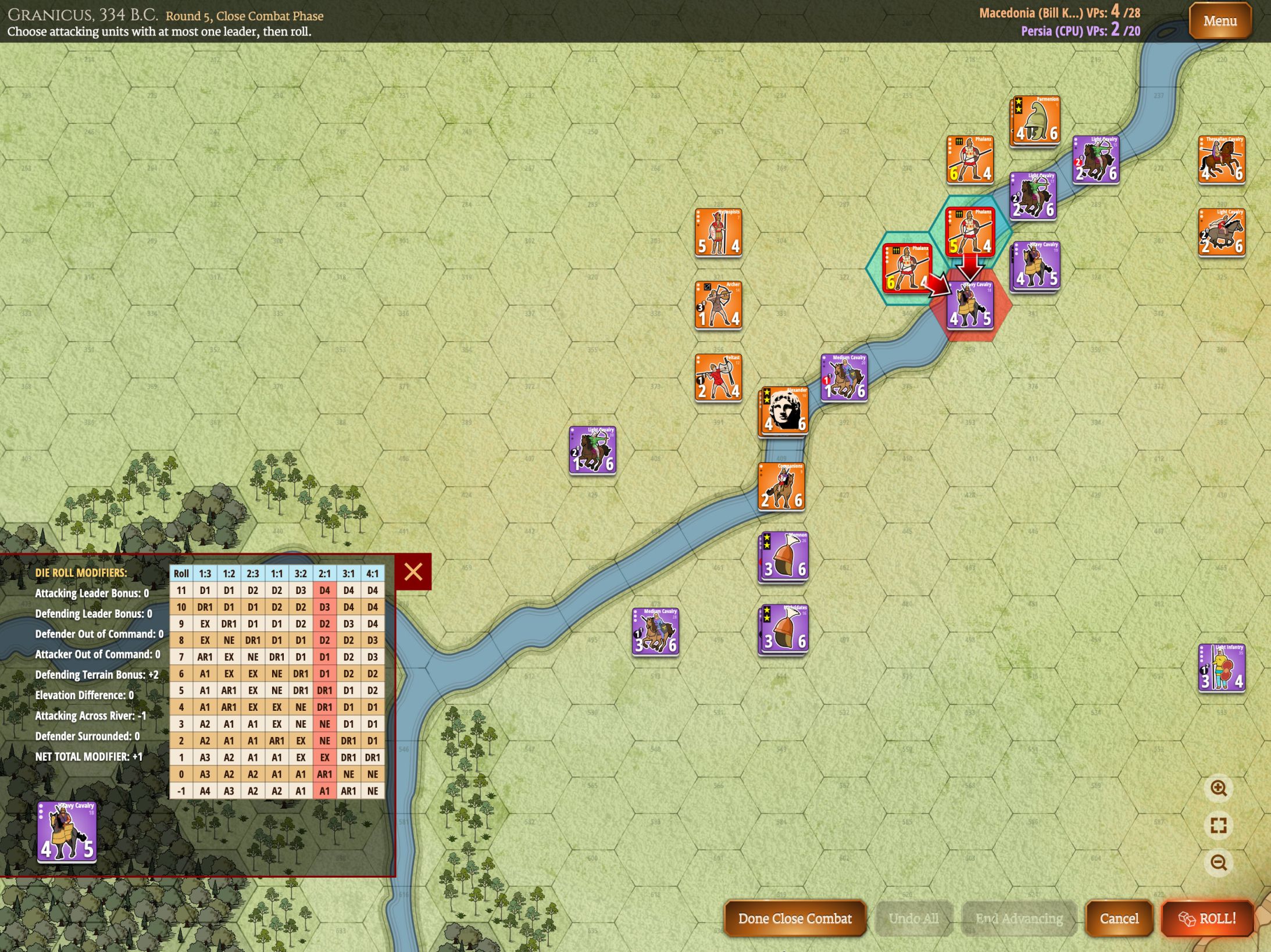 Along the way, there are little rules wrinkles such as Archers being able to fire back, phalangites and hoplites getting bonuses for being adjacent to other like units, and elephants trampling surrounding units. During Ranged Fire and Close Combat, in-game, collapsible panels appear that will display your combat tables and highlight the relevant column and/or result.