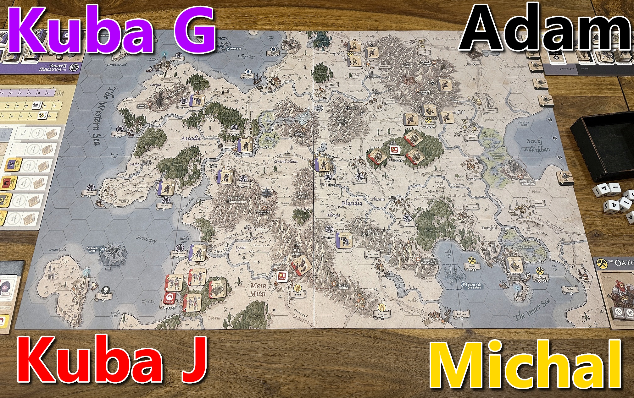The game finished in resistance (that is my and Kuba G.) victory. It was not a resounding defeat of our opponents (Kuba J and Adam), but rather “victory via small points” – opponents were able to secure 7 settlement, while they needed 11 to win. There were moments when they reached 10-11 in their turn, but the last world always belonged to Eastern Empire who was able to reconquer some of the lost territory to prevent the defeat.