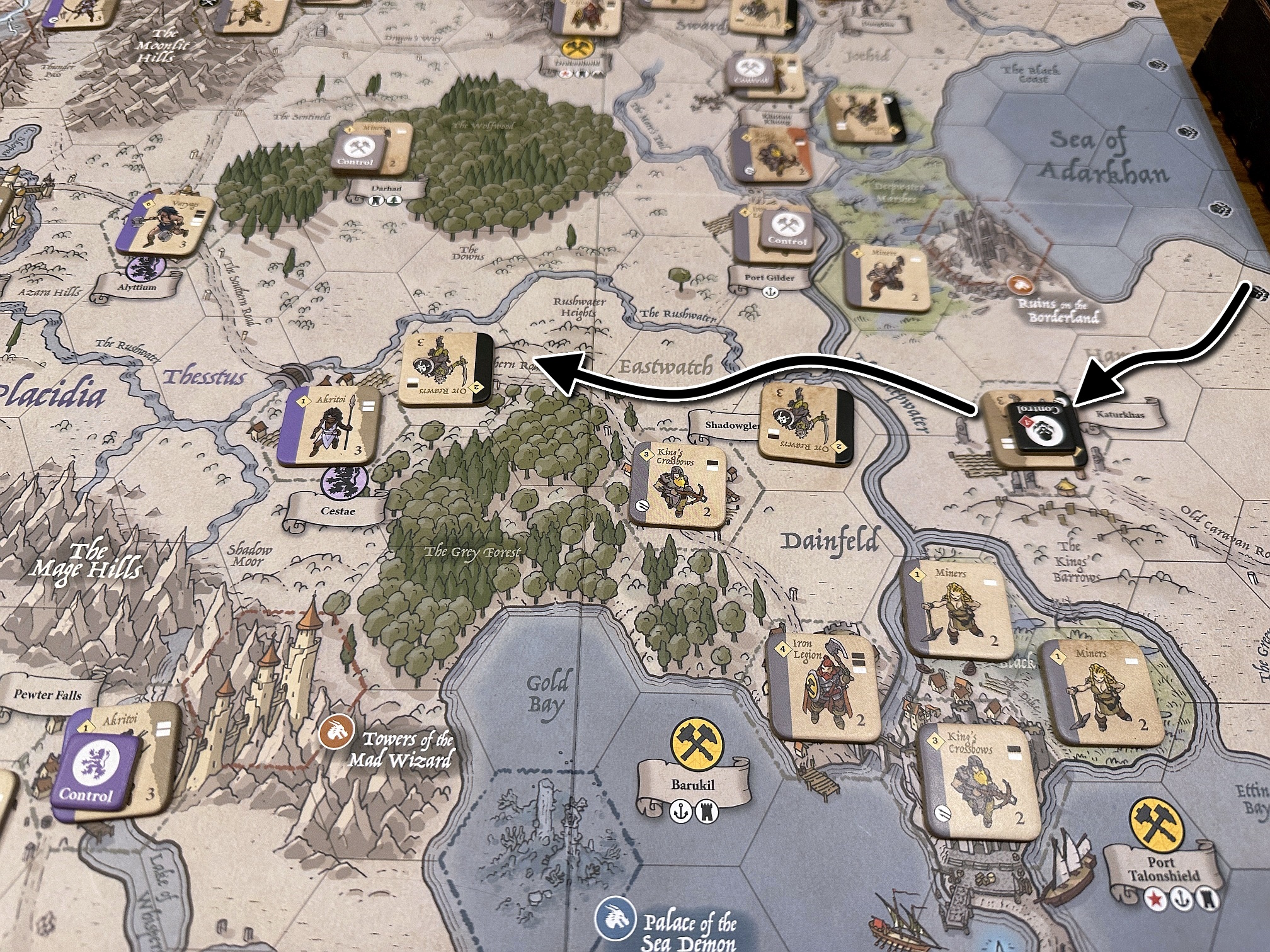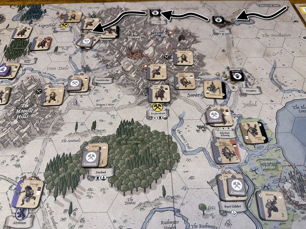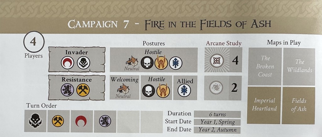So what is the main goal and aim of the game? Not surprisingly, the Invader (Army of the Night + Orcs) will win if at the end of any season control at least 11 settlements on both maps which are used for the play (Imperial Heartland + Fields of Ash). The resistance (Oathborn + Empire) try to prevent it, and that way gain the victory at the end of the sixth round.