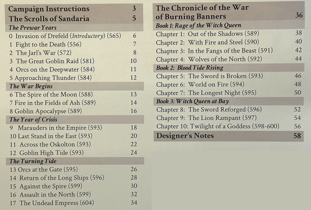 - Scrolls of Sandaria – it consists of an Introductory campaign designed to help players learn the game, followed by seventeen self-contained Campaigns from different periods in the Burning Banners timeline.
