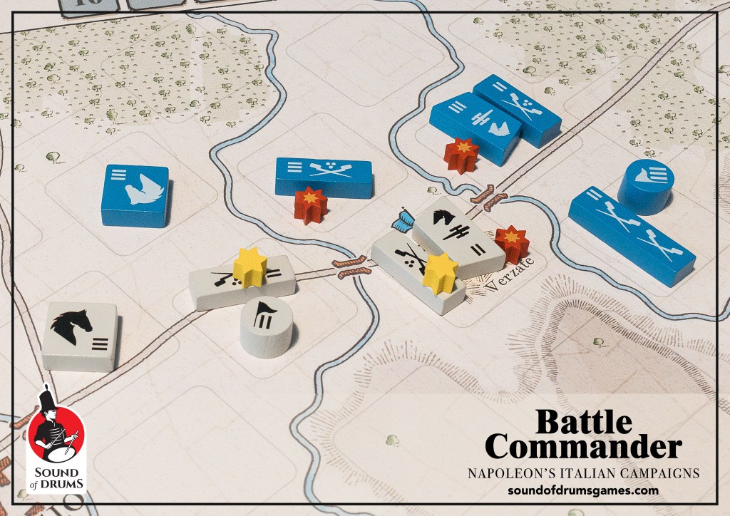 Carl: I wanted create components with a distinctive “period feel”, using painted-on custom wood blocks (no stickers!), a set of three mounted maps with a-grid system that effortlessly manages historical formation intervals, and stylish graphics: the package harks back to the 19th century “Kriegspiel” wargames’ appearance, mimicking a contemporary Napoleonic battle maps’ look, instead of a pure hex & counter affair more attuned to modern-era operational conflicts.