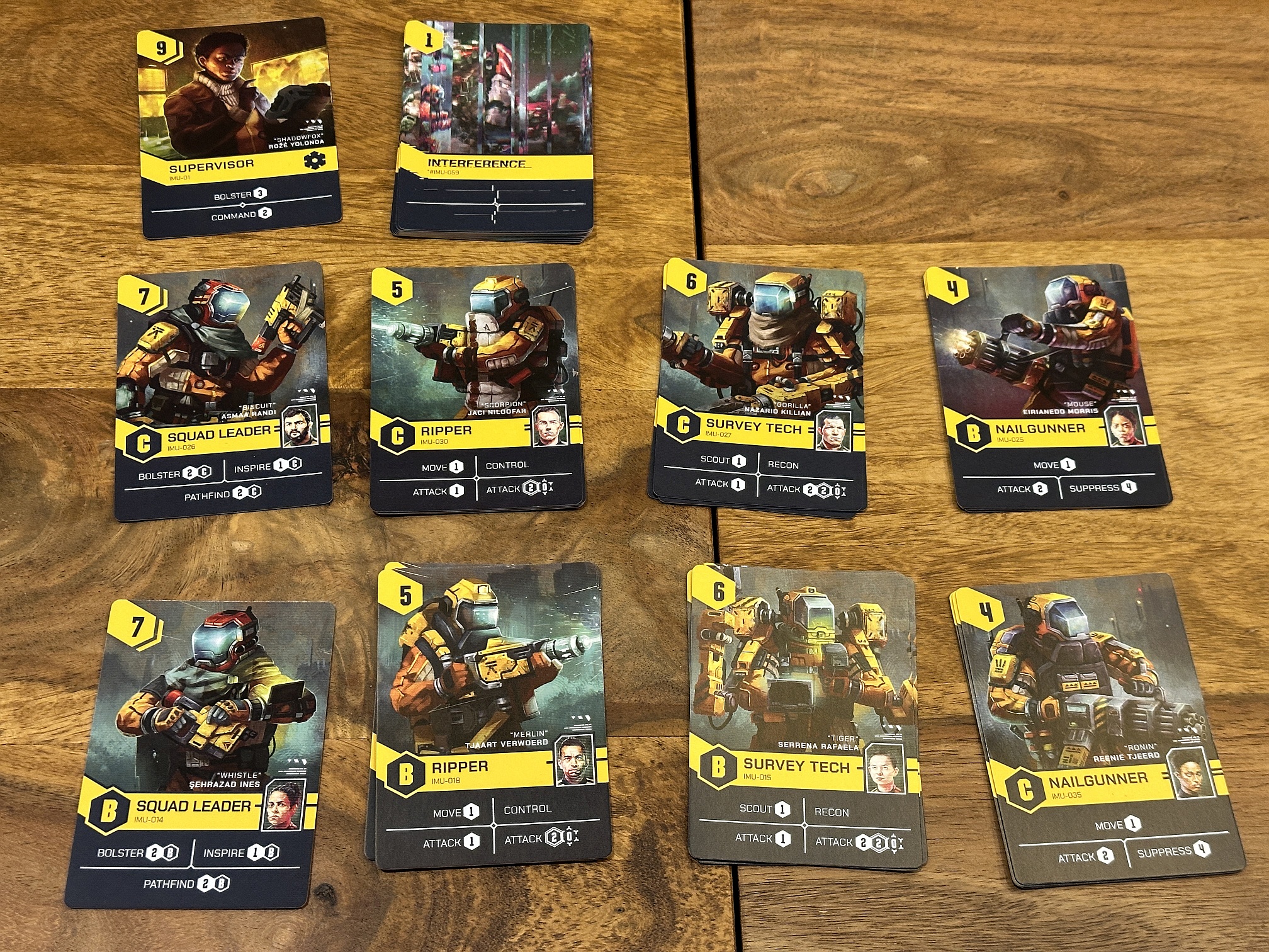 Lastly, I’ll mention the introduction of mechs. These are massive, imposing units on the battlefield, and we wanted their operation to feel special. Each mech consists of five cards: a commander, two cards for the gunners, and two cards for the navigators. This allows the players to deck-build their mech in a way that can either focus on mobility or firepower.