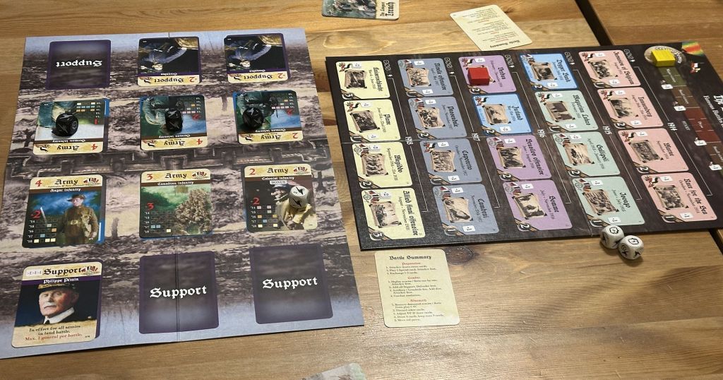 Na rozgrzewkę z Kubą G. zagraliśmy The Longest Trench – ciekawy tytuł o pierwszej wojnie światowej, na wysoce strategicznym poziomie, gdzie kartami armii, wsparcia i artylerii rozgrywamy kolejne bitwy tego konfliktu. Jest tu kilka bardzo ciekawych mechanik, chociaż losowość też robi swoje. W naszym pierwszym podejściu Państwa Centralne Kuby wygrały w 1916 z Aliantami prowadzonymi przeze mnie – niestety, bitwy o Verdun Francuzi nie wygrali. Pewnie spróbujemy zagrać ponownie.