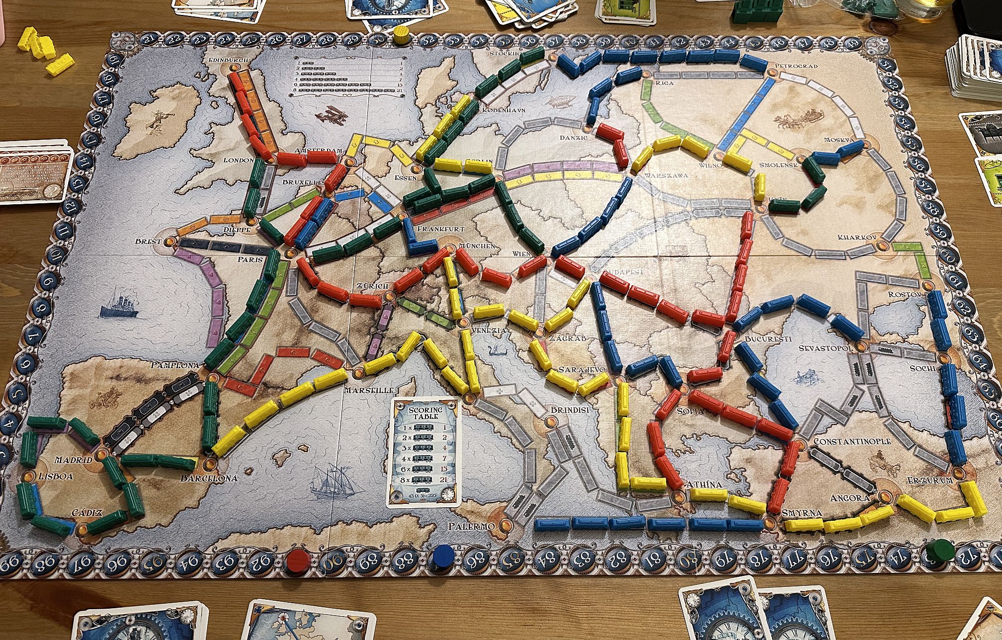 Na koniec pora opisać prawdziwy klasyk – Wsiąść do Pociągu. Ponownie, brylowała w nim Marta (87 punktów), ale jednak tym razem została wyprzedzona przez swoja mamę – wygrała Magda S-W z 91 punktami, podczas gdy Agnieszka miała 73 a Magda K 31. Jak widać, ta gra się nie starzeje i kolejne pokolenia szlifują swoje planszówkowe umiejętności.