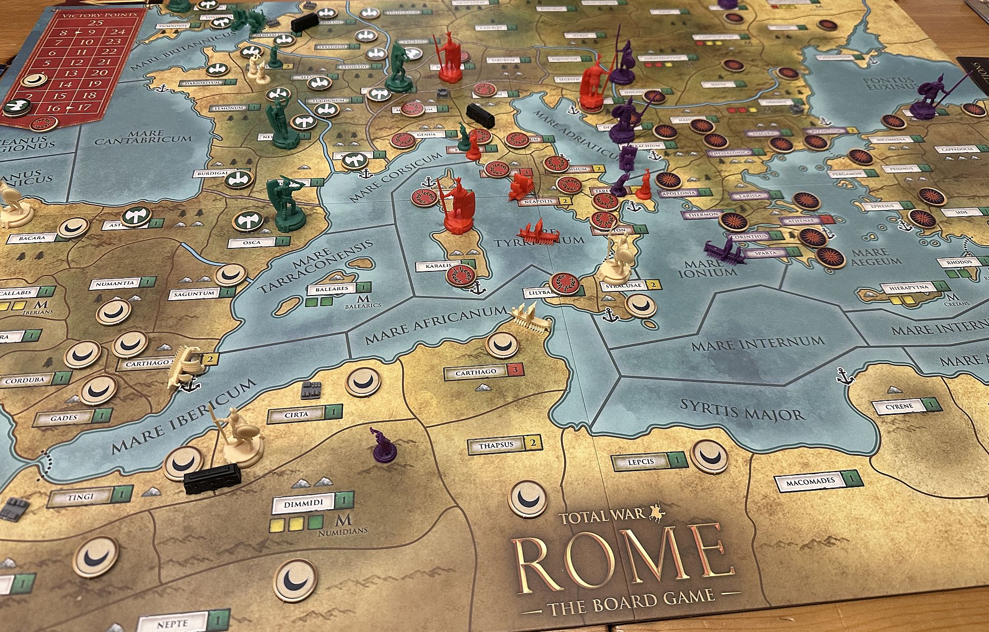Drugiego dnia przy stoliczku męskim (ja, Kuba G., Łukasz i Jarek) cały wieczór królował Total War Rome – The Boardgame. Przy czym królował to trochę przesada – siadaliśmy w większości do tej gry z dużymi oczekiwaniami i lekkim sentymentem – wielu z nas znało ten tytuł z wersji komputerowej. I faktycznie, wiele mechanik bardzo pozytywnie nas zaskoczyło; niestety, złożone jako całość nie budowały spójnego obrazu a zasady były napisane na tyle niejasno, że wielokrotnie mieliśmy znaczące wątpliwości i musieliśmy sami uzupełniać luki instrukcji.
