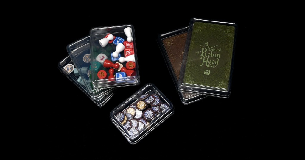 A Gest of Robin Hood is an incredibly beautiful and elegant COIN-adjacent game. It allows players to get into that great world without the usual overhead of the system. So it also needed a proper, dedicated and tailor made storage and sorting solution. The cards will be kept in Tarot-sized trays, each player will have their components separately plus we use Euro small card holder for money.