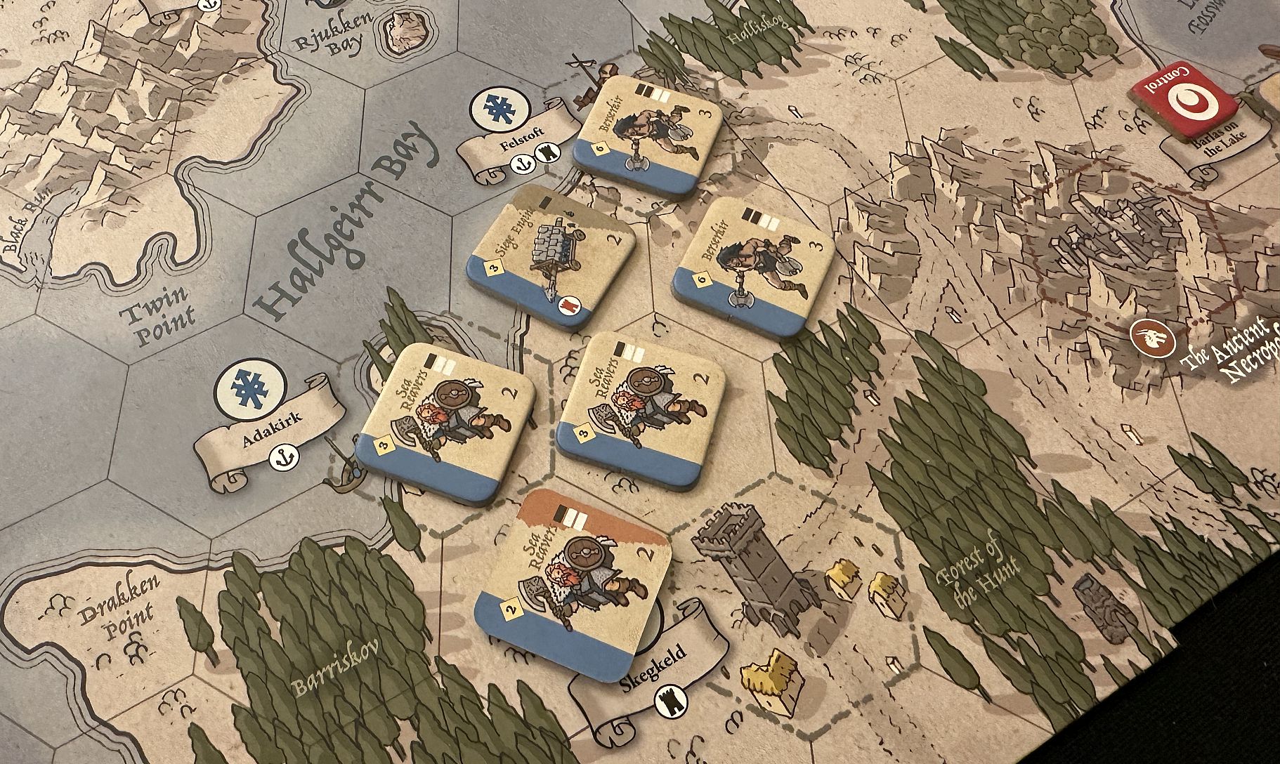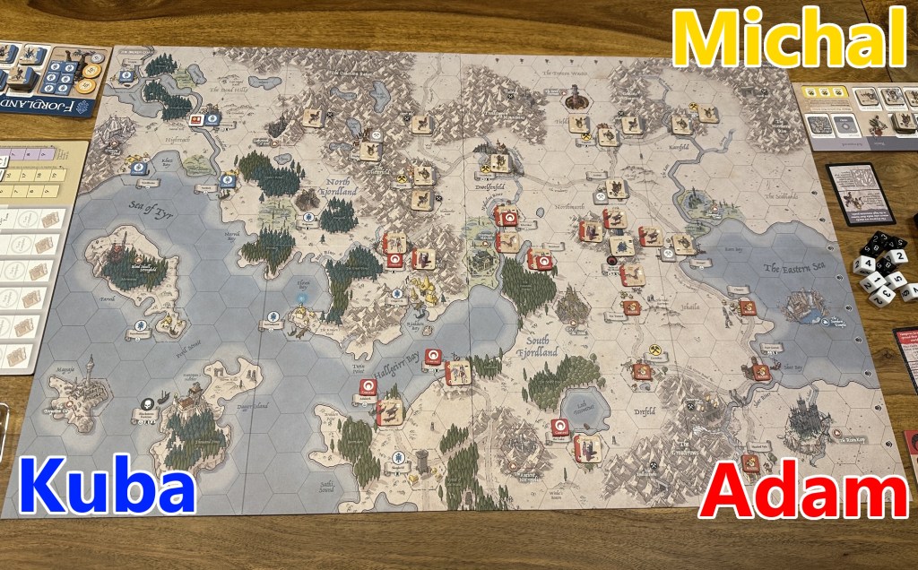 This title accommodates any number of players between two and six – which is truly great. However, I really wanted to check again how it will work with three factions. This is usually the most difficult set-up – here made easier from the start as there always will be a “two versus one” set-up in Burning Banners, not every side individually.