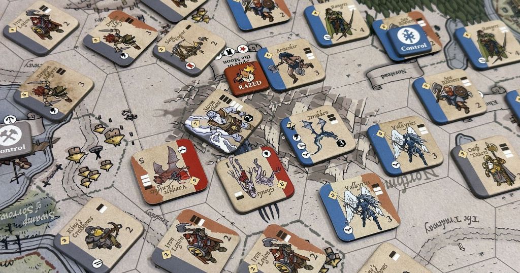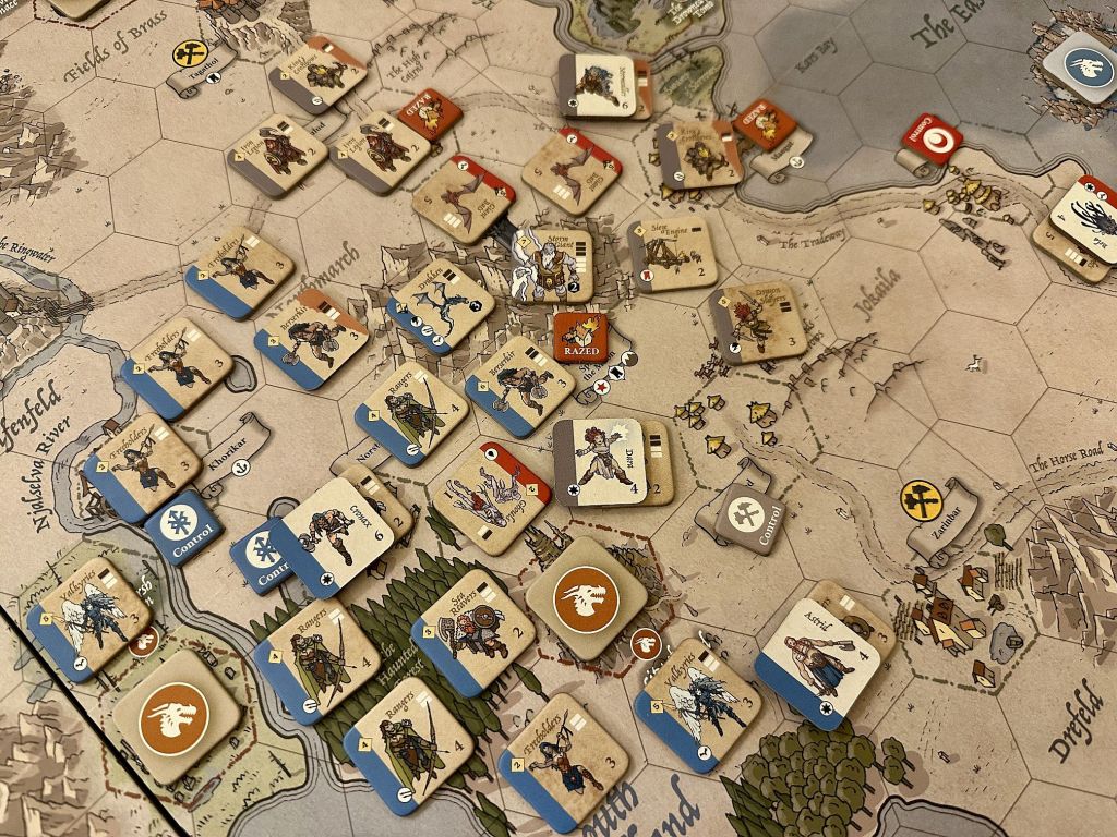 Couple of words about Burning Banners for those who are not familiar with it. If you know the game – feel free to skip to the next section. In essence, this is a fantasy wargame for two to six players. It is really fast playing and intuitive, and features a whopping 29 scenarios, of various size, length and complexity. They range from short campaigns with 2 Kingdoms and one map, to the entire 12-year war, in which 6 kingdoms battle over four maps. Possibility to play with Basic and Advanced Rules, as well as with one of the six featured factions (Goblins, Orcs, Army of the Night, Oathborn, Fjordland and Eastern Empire) allows for endless hours of great joy!