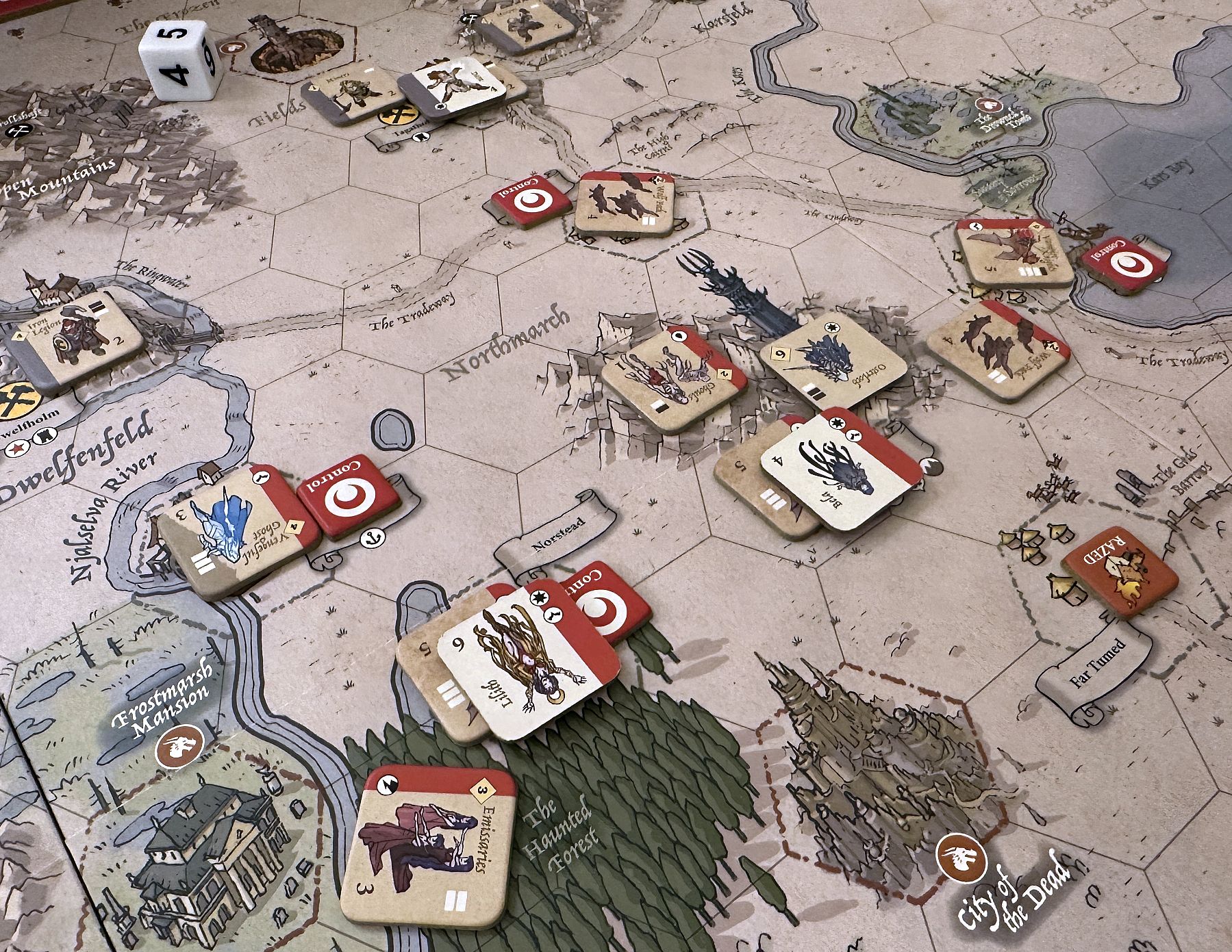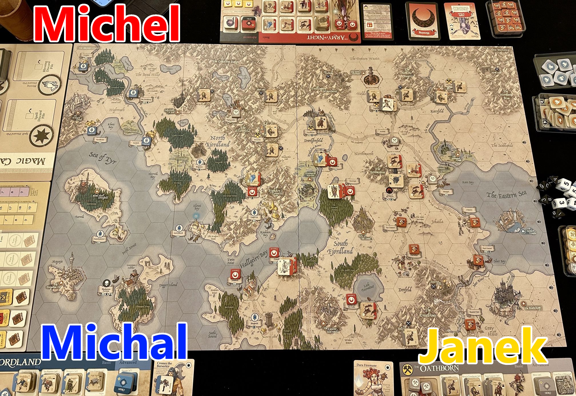 That was our second scenario played with three players. I must say, it did not feel awkward nor somehow artificially distributed among three sides. The Army of the Night was boosted with Osterloh, usually attacked all the villages near the Spire to create buffer and get some money. On the other hand, there were two Resistance factions, so it was rather up to them to find the way to crack the opponent.