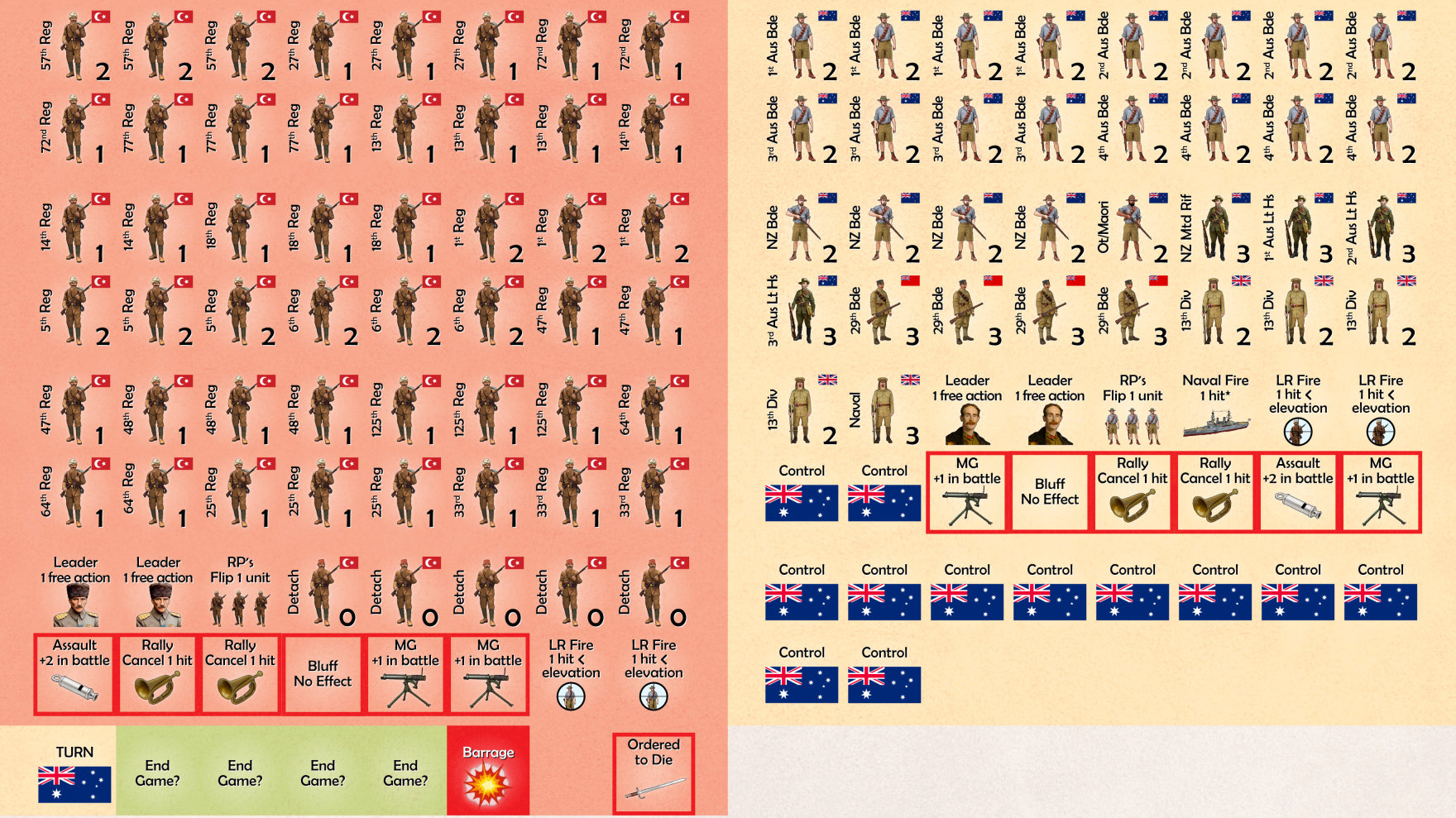- The Landing: This is about the initial landing at Anzac Cove on 25th April, 1915. It’s where the Anzacs disembarked from their boats just before dawn and began attacking uphill into the steep cliffs and ravines of the area. This scenario is not only the best introduction to the game, it is also the most fluid and dynamic of the three. There will be a lot of movement, as both sides attempt to stake out a viable front line amidst the chaos of an amphibious landing in very uneven terrain. As the Anzacs, your battalions are landing in four waves of four units each. Basically, you start with four units ready to land and will get another four units every second turn. You are in a race against time and a race against your Ottoman opponent – you need to get enough high ground under your control to meet the victory threshold. Historically the Anzacs were expected to take Chunuk Bair on the first day of the landing- this was a near impossible task given the strength of Ottoman units in the vicinity and in the game you will find it just as difficult. So don’t race straight for the highest point on the map (Chunuk Bair) – you will overextend yourself and probably allow the Ottomans to cut your supply or slow you down with weak detachments deployed in depth.