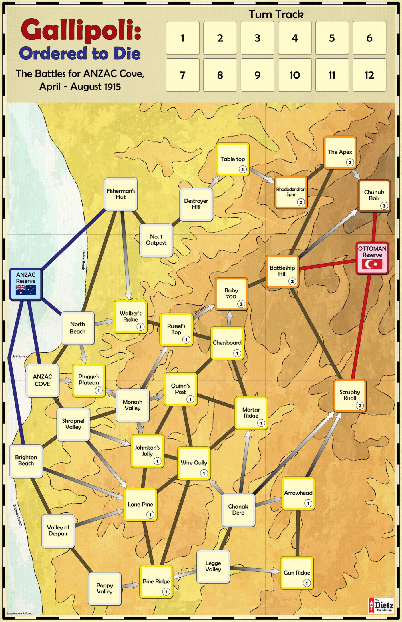 Clint: Well, there are very few games on Gallipoli. And none that fit this particular niche – playable in an hour, accessible to a broad audience, diceless euro-style combat while still being an actual wargame with historical unit designations, a map and multiple scenarios. I think the combat system and the Leadership Chits, described above, are the signature mechanics of this game and the thing that will keep players coming back to it. I like to keep thing simple while focusing on meaningful player decisions and I think the game achieves that very well.