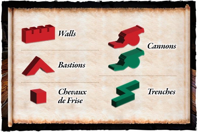Francisco: Like the other games in the “family” is a card-driven block game. Blocks and cards allow for a certain amount of uncertainty to appear in the design, contributing to the stimulating decision making process of players with partial information and unknown events in your enemy’s hand. Also other elements are made of wood: there are wood pieces for Ottoman siege trenches, Ottoman and Spanish artillery batteries, Spanish redoubts, Chavaux-de-Frise and the city walls. There are also wooden disks depicting each side leaders.