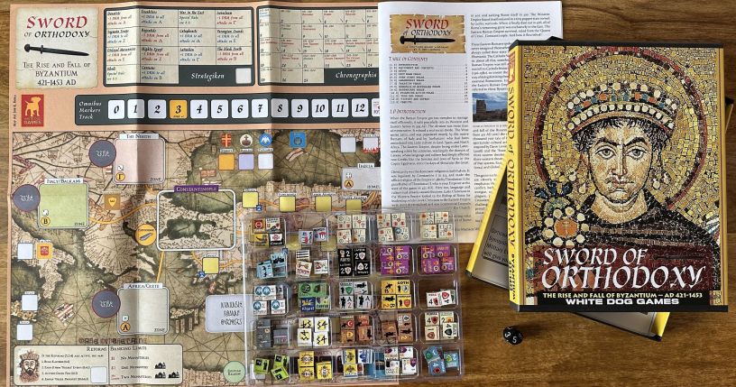Sword of Orthodoxy: The Rise and Fall of Byzantium 420-1453 is one of latest titles from Ben and leads us through over one thousand years of Eastern Empire – or, as the Western historians call it – Byzantium. Designer created here an interesting mix of classical state-of-the-siege approach, with tracks on which enemy is progressing – that will be for eastern part of the map – with a new approach, seen in KaiserKrieg or Global War, where you accumulate enemies in one box until they reach the threshold for crisis to unleash.
