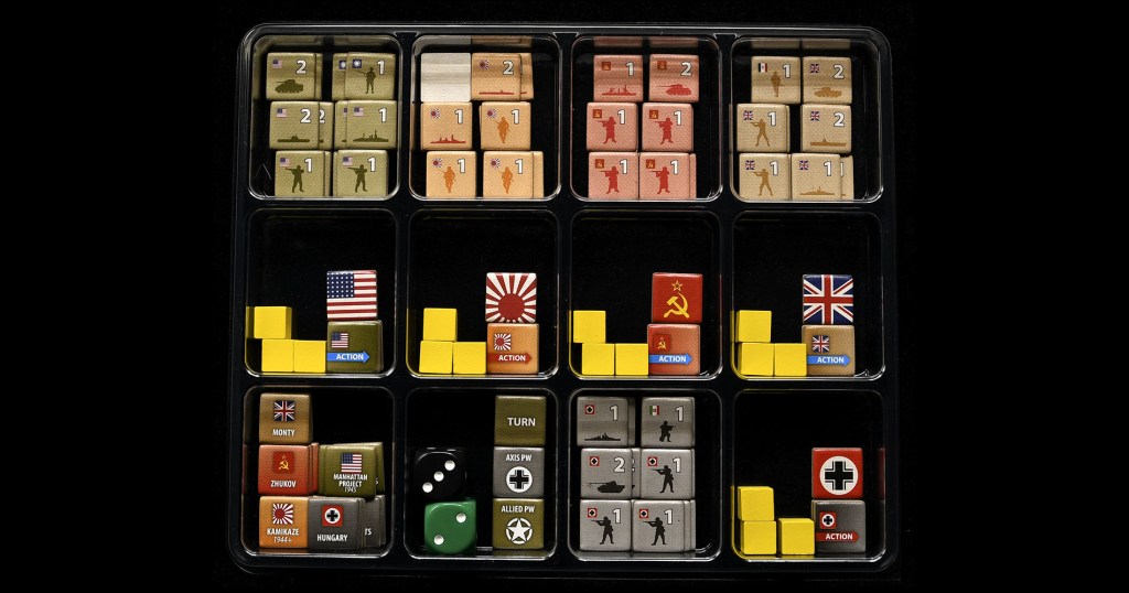 One Hour World War II is a really fun team-based wargame to play. Quick, replayable, strategic level with some great Optional rules. It features a large storage solution already in the box; however I prefer the small, compact one which I created using just one Cube4Me tray.