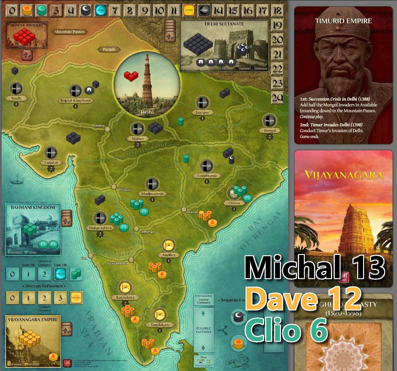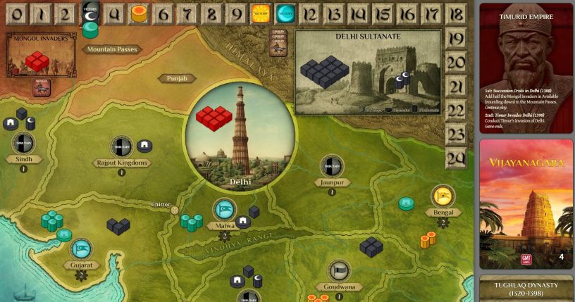 Regular play is also periodically interrupted by the actions of the non-player Mongol Invaders, who threaten Delhi from the northwest, and the game ends with the climactic arrival of the great Mongol warlord Timur.