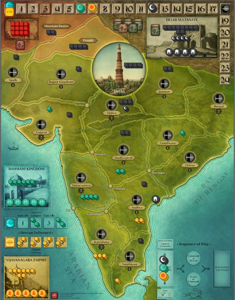 Sultanate starts with 18 VPs, while potentially rebelling forces with zero. The disparity in resources is also huge12 for Sultanate with 6/7 for emerging powers. So the initial strategy is simple – cooperation between Bahmani and Vijayanagara, at least till the time when Rebel command becomes available (after 1/3 of the game). Let us see how it worked!