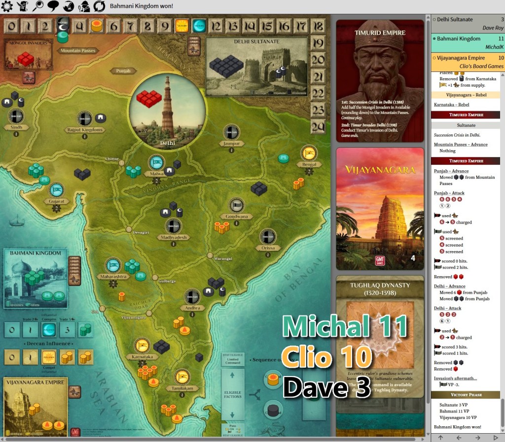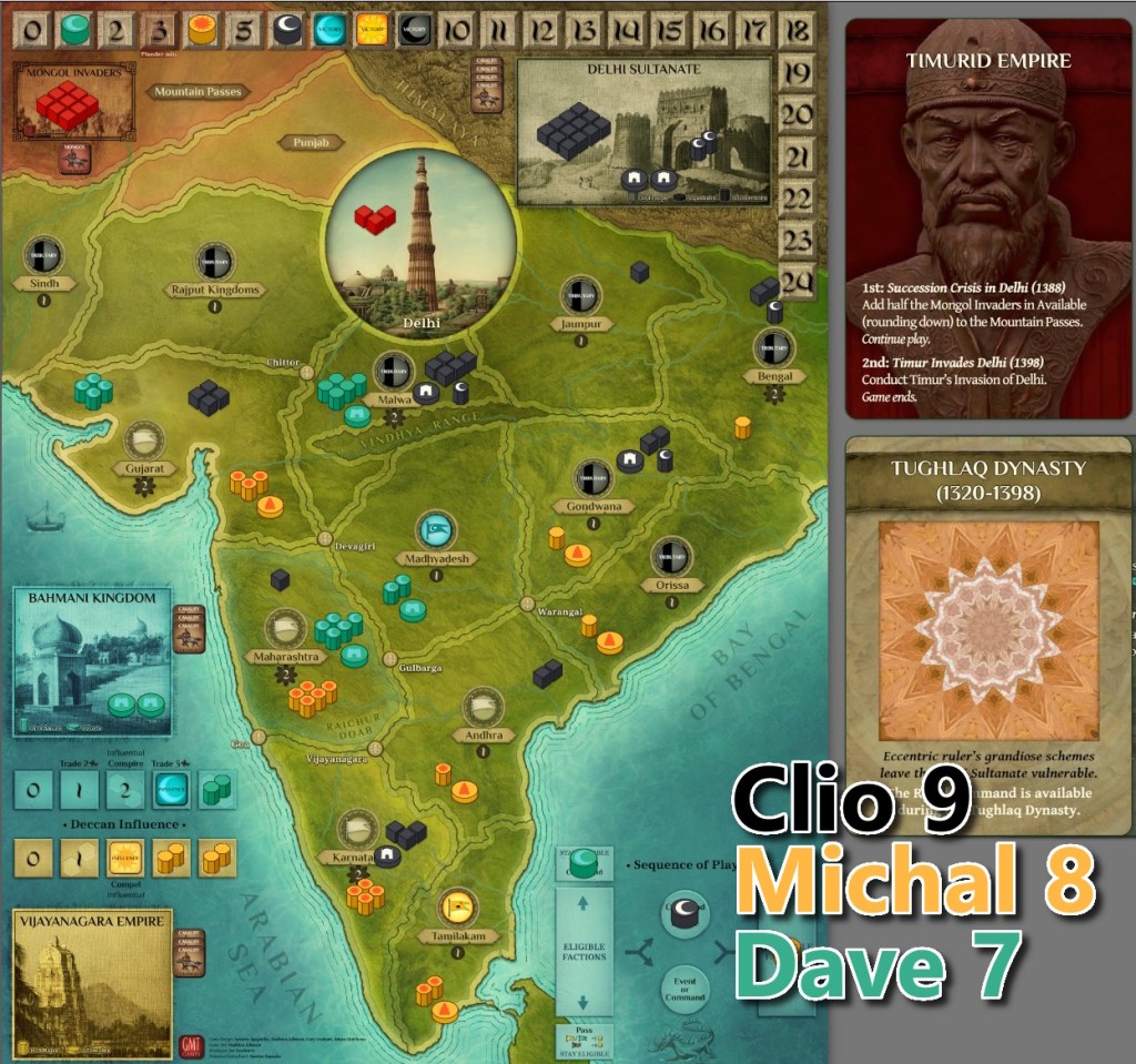 Session 3 – this time Dave took responsibility for Sultanate while me and Clio for the rebels. Unfortunately we were not kind to our overlord – nor the Mongols. Again, the game was tense, the victory in balance to the last move and result – first so far rebel (Bahmani) victory! But again, only by 1 point!