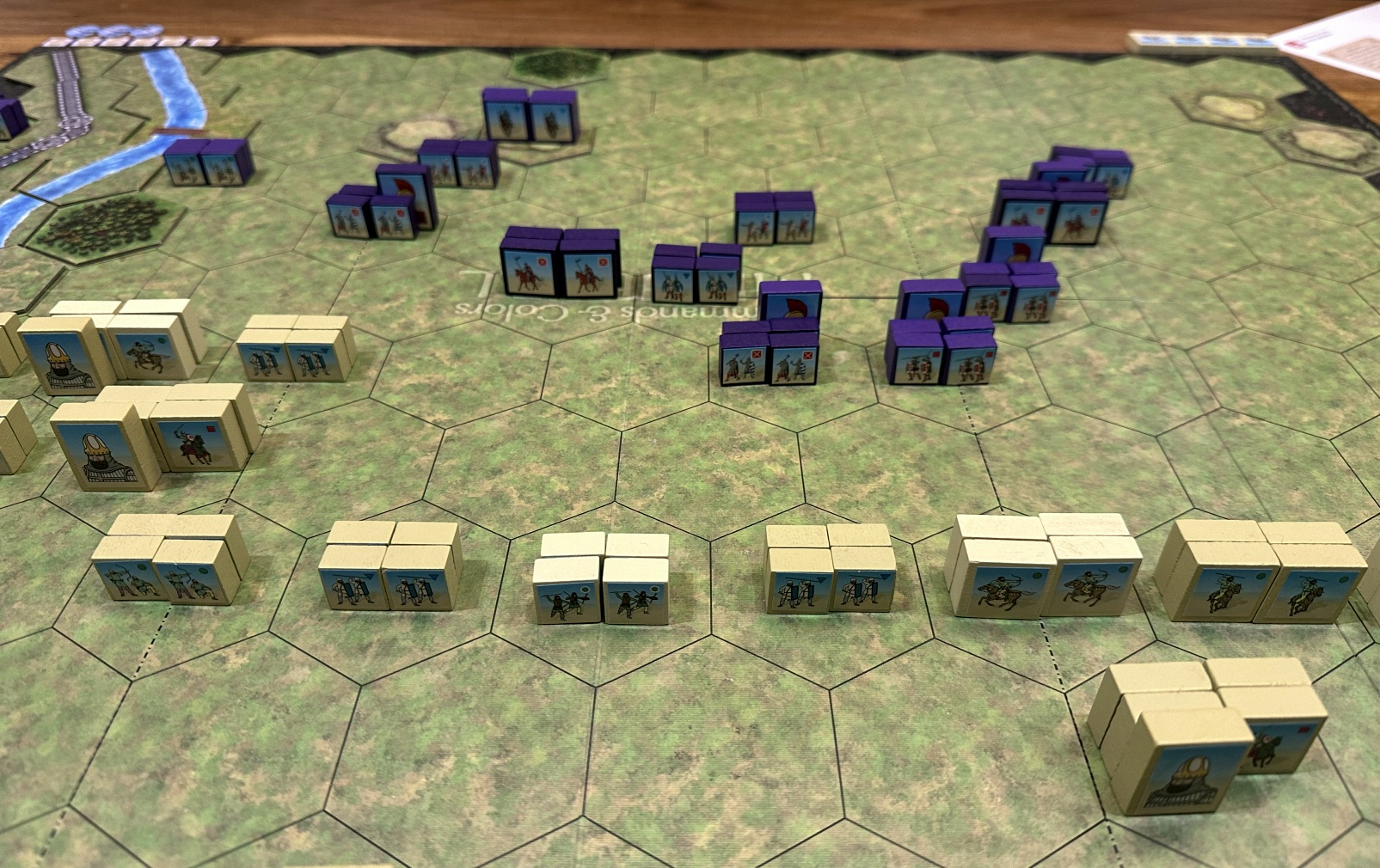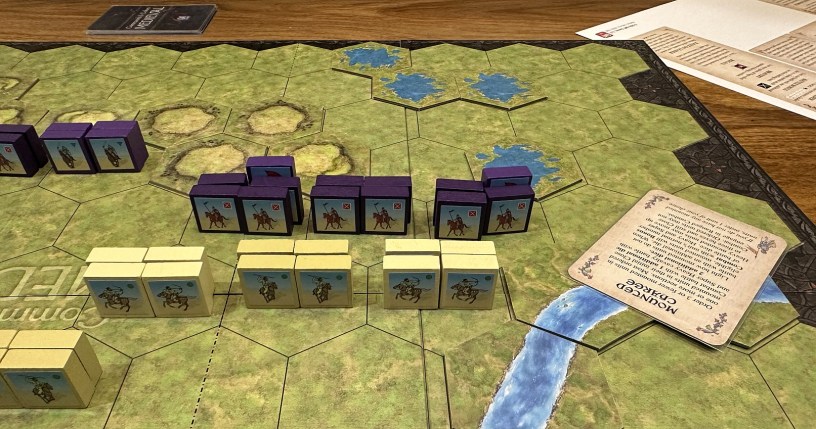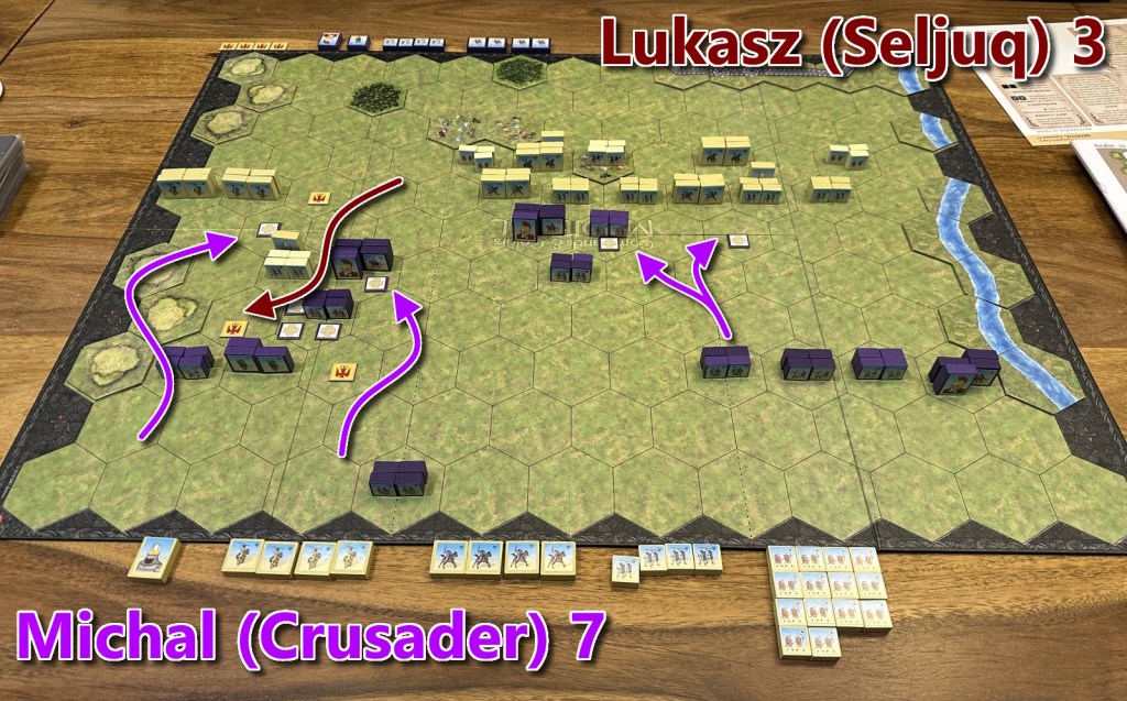 I love how each and every scenario in this expansion is different from the others. Here we have just several Crusaders units – but these are predominantly the elite Knights! The terrain is very confined due to rivers, my Turk units in disarray, prone to the frontal assault from the enemy. But those light mounted archers will have some tricks up their sleeves – like Evade, Parthian Shot or Feign Retreat.