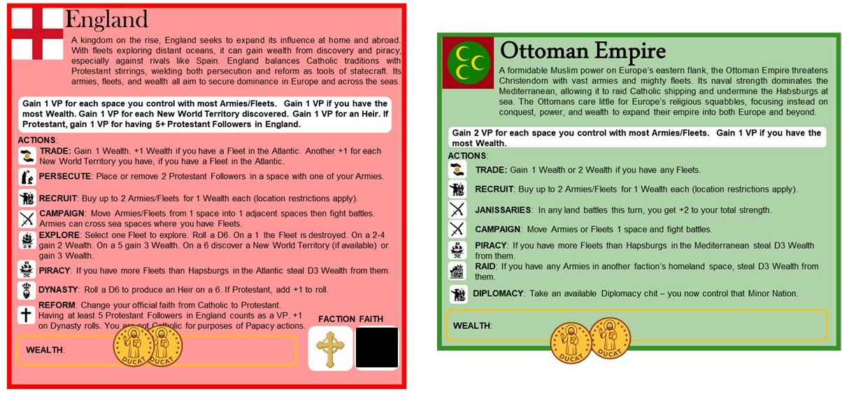 This was because I wanted the Papacy to have some of physical presence on the map like the other factions. This was loosely inspired by the building tokens in games like Root or the resources placed on the map in Scythe. It has the advantage of opening up the Papacy’s primary victory metric to attacks from the other factions. Just like Protestant Follower pieces, papal Church pieces can be attacked and removed. This represents iconoclasm and persecution of Catholic clergy, as well as periodic waves of destruction like the Sack of Rome in 1527. Unlike Protestant Followers, I had the Papacy’s Churches cost Wealth. This Wealth is gained entirely through the Tithe action – which takes money from any nations that are still Catholic. Early in the game this includes three out of the six factions: Habsburgs, England and France. But England and France might convert to Protestantism, and a greedy Pope constantly demanding their money might hasten this on!