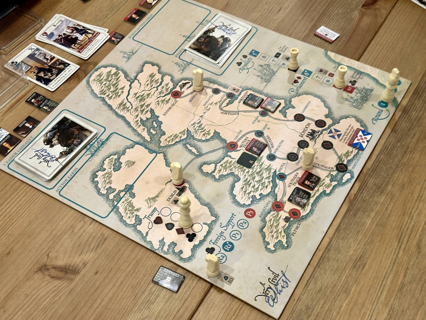 Tego dnia z Kubą G zagraliśmy wiele tytułów dwuosobowych – obok odbywała się duża partia w SETI- a jednym z nowych, do tej pory nie relacjonowanych była wojna domowa w Anglii w 17 wieku autorstwa Freda Servala – czyli “A Very Civil Whist”. Bardzo ciekawa koncepcja, gra zrobiona na szybko przed konwencją, zdecydowanie daje dużo satysfakcji,