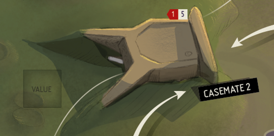 Instead, the 1st Battery deck becomes depleted as casualties are inflicted on the defenders and they – abstractly – retreat to the safety of the casemates (reflected by an increasing Casemate Defense Value). At the same time, cards controlling the return of Steiner and the arrival of the Half-Track are placed into the Main deck, and as they are drawn, both Steiner and the Half-Track move closer.