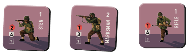 Merville Battery however introduces Range, with Rifle and Marksman counters having a longer range, but Sten Gunner counters having a shorter range but generating more Attack dice.
