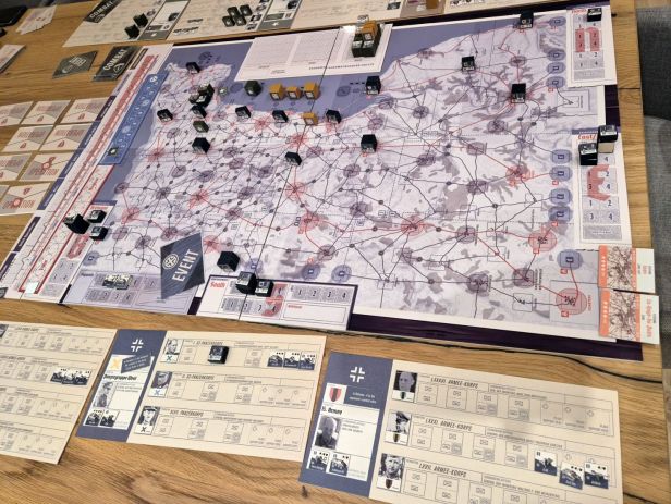 Clem: It’s an alternate activation system. One player activates units in a sector, then the opponent does the same. The fights are resolved by adding or subtracting combat values and various bonuses/penalties, and the combat and event cards bring the chaos of the battle. The German player has specific mechanics, such as a spy gameplay where they gamble victory points to cancel the benefits granted by the Ally’s objective cards. They also may spend victory points to convince Hitler to send more reinforcements. The Ally player has to plan their objectives, in what order and when. And so many little things but i don’t want to spoil the entire game.