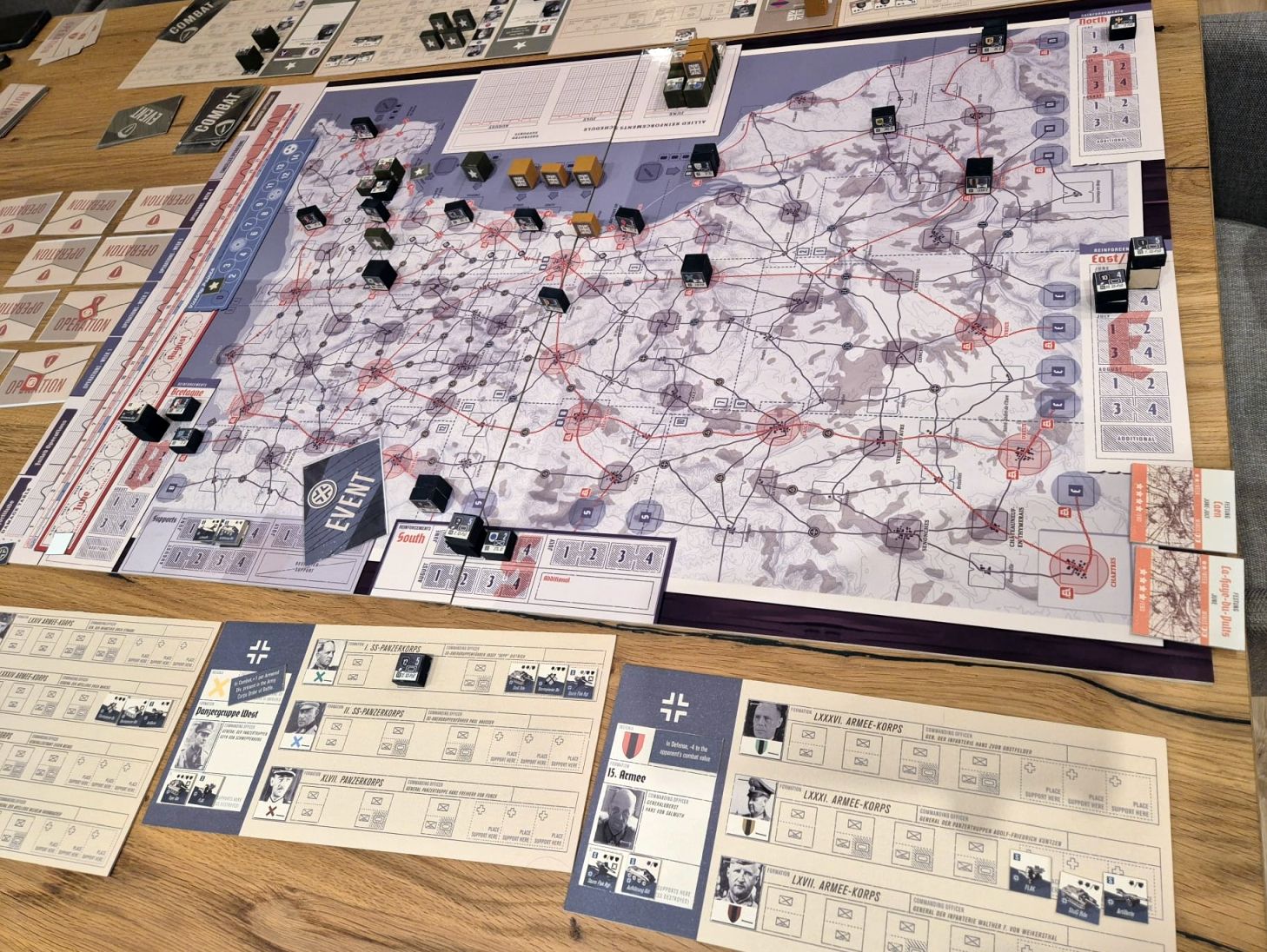 Clem: It’s an alternate activation system. One player activates units in a sector, then the opponent does the same. The fights are resolved by adding or subtracting combat values and various bonuses/penalties, and the combat and event cards bring the chaos of the battle. The German player has specific mechanics, such as a spy gameplay where they gamble victory points to cancel the benefits granted by the Ally’s objective cards. They also may spend victory points to convince Hitler to send more reinforcements. The Ally player has to plan their objectives, in what order and when. And so many little things but i don’t want to spoil the entire game.