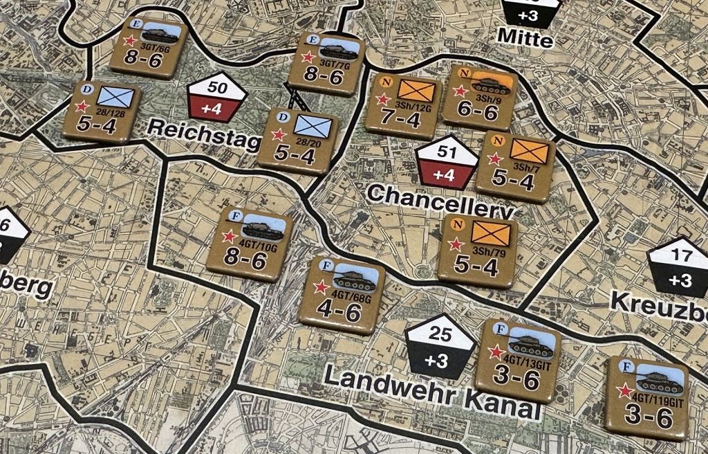 The game presents a nine-turn campaign covering the Soviet assault on Berlin in April and May 1945. As Soviet forces push deeper from the suburbs into the industrial districts and heavily fortified government buildings, German resistance intensifies while Soviet units gradually become exhausted and ineffective. Despite mounting losses, the offensive cannot slow – Stalin is watching and demands the capture of the Reichstag by May Day. Victory is achieved by forcing the German defenders to surrender, while failure comes if Stalin’s approval drops too low.