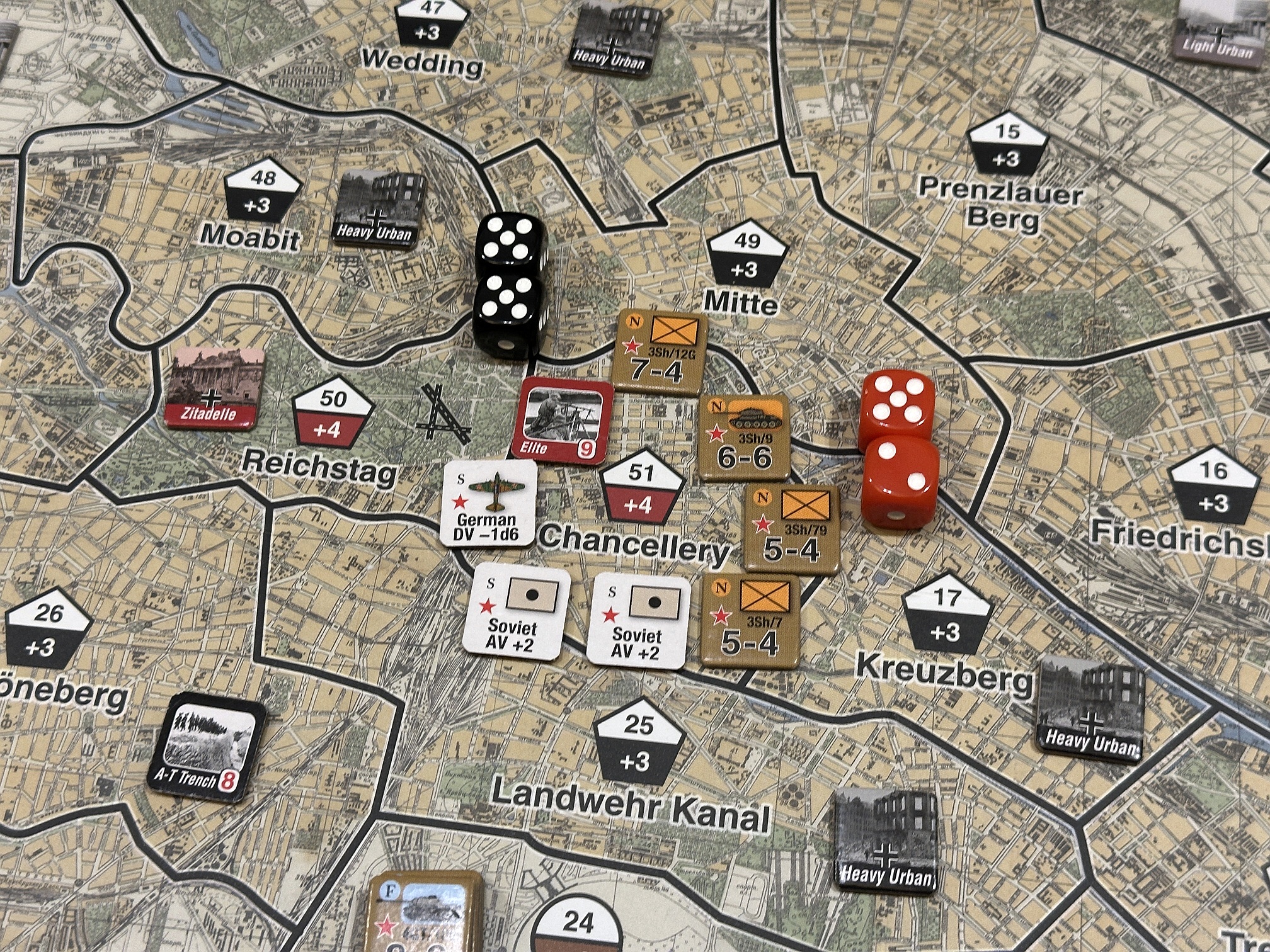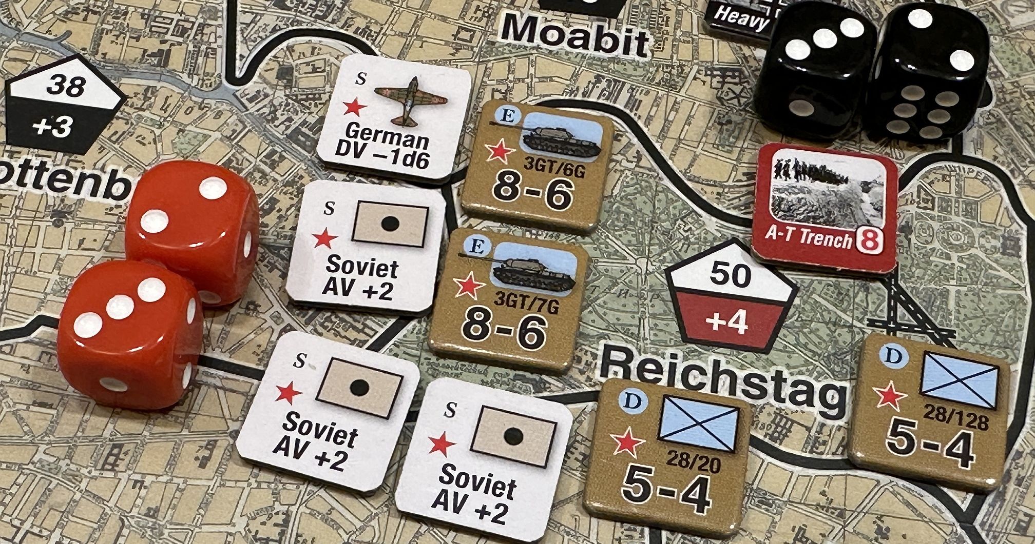 The game presents a nine-turn campaign covering the Soviet assault on Berlin in April and May 1945. As Soviet forces push deeper from the suburbs into the industrial districts and heavily fortified government buildings, German resistance intensifies while Soviet units gradually become exhausted and ineffective. Despite mounting losses, the offensive cannot slow – Stalin is watching and demands the capture of the Reichstag by May Day. Victory is achieved by forcing the German defenders to surrender, while failure comes if Stalin’s approval drops too low.