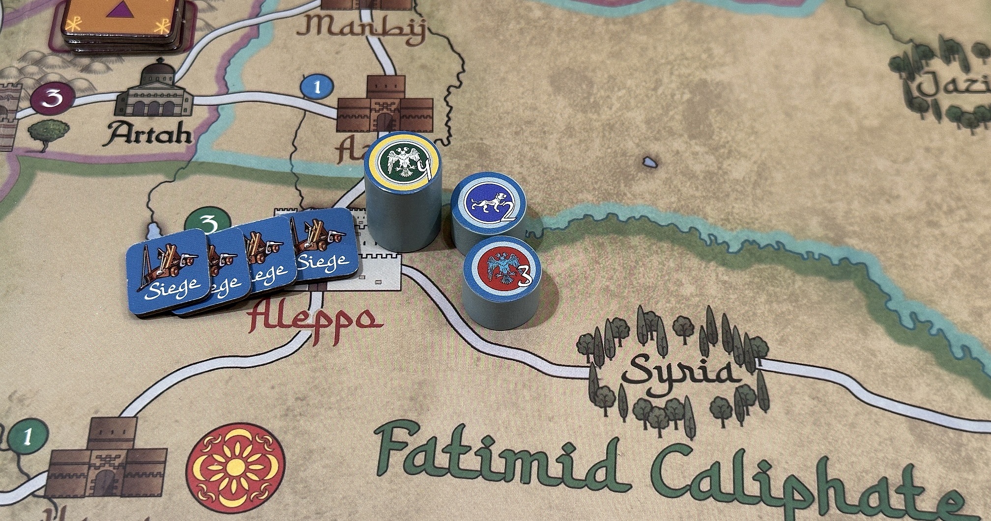 Or maybe not? I decided to heavily invest in siege, putting as many as four siege markers. That meant that on roll for surrender (Allepo is special case, rolls 4 dice) I needed on each 1-4. I tried several times and failed…