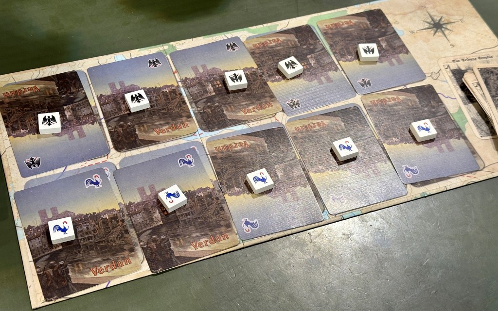 | About game: | Essen Spiel is always a fantastic place to discover new titles – even wargames. Verdun from the Finnish publisher Dragon Dawn Productions was one such find for me. I had the chance to play it, and its clever trick-taking mechanics used to resolve combat and scoring really stood out. Combined with beautiful, thematic components and constant tough decisions, it quickly became an easy choice to add to my collection. The game supports both 1v1 and 2v2 modes, recreating the struggle between German and French forces on the World War I battlefields of Verdun. Players start with a fixed set of cards, and as their hands shrink, they are often forced to play cards that may benefit the opponent, making timing a critical element. It has an introductory mode, full game, a small expansion with additional cards and weather – all of which makes it a pretty replayable title. As each time you will get different hand, different defense disposition and victory areas placement – you will never get two identical sessions ever! So, would you stand-up to the task and manage to prevail against odds, leading your forces to the victory in the field? |